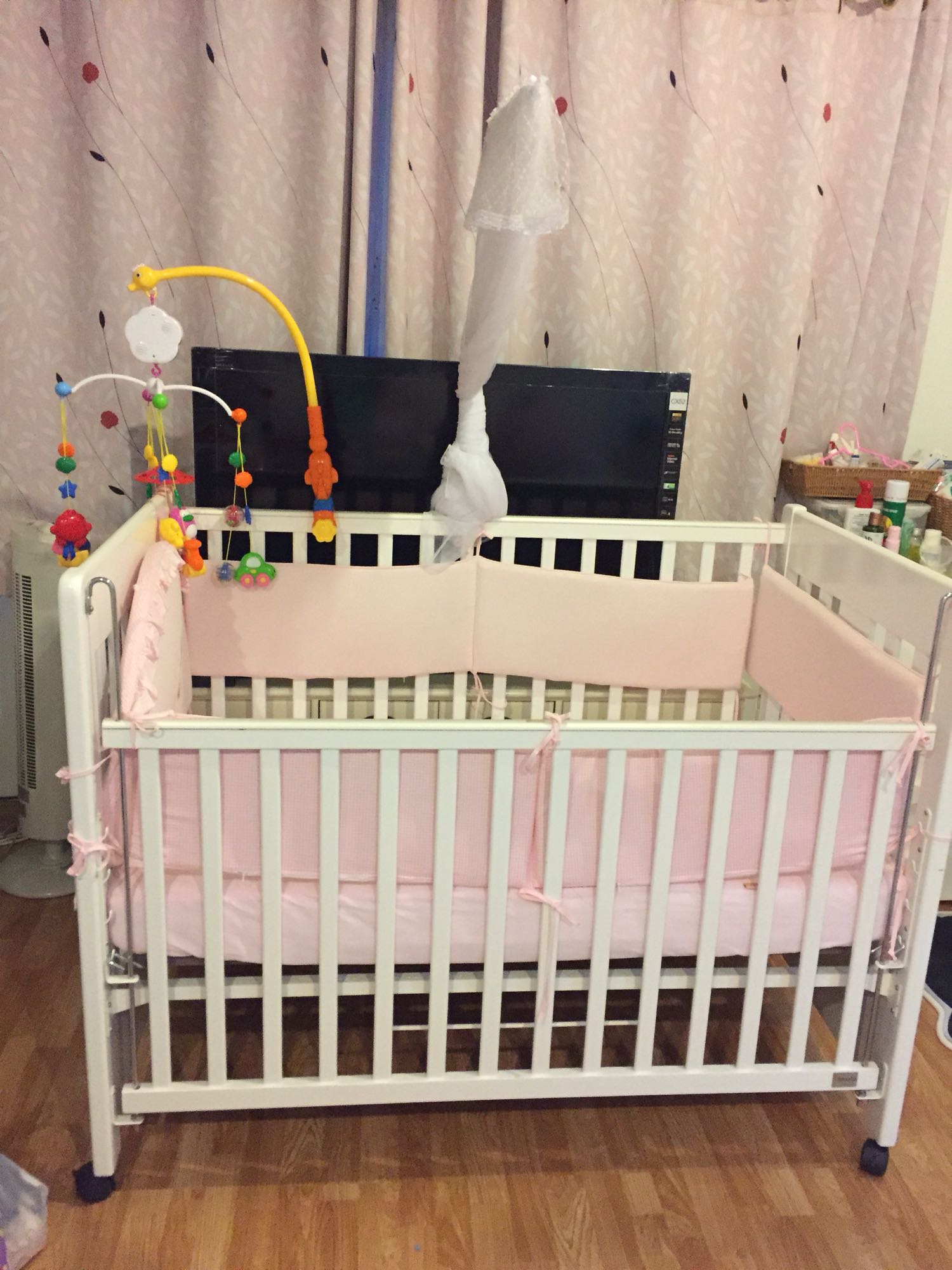 เตียงเด็กสีขาว มีส่วนขยาย สำหรับทารกแรกเกิดถึงอายุ 8 ปี พื้นเตียง สามารถปรับระดับขึ้น-ลงได้ 4 ระดับ ข้างเตียงสามารถปรับขึ้น-ลงได้ 1 ด้าน ปลอดภัยด้วยระบบล็อค 2 ชั้น (DOUBLE SAFETY LOCK) พร้อมพลาสติค (FOOD GRADE) ครอบด้านบนของแผงกั้นข้างเตียงกันเด็กกัดขอบเตียง ซี่ลูกกรงข้างเตียงมีระยะห่างที่ได้มาตราฐาน ศีรษะไม่สามารถลอดออกได้ สะดวกในการเคลื่อนย้ายด้วยล้อเลื่อนนิรภัยที่มี LOCK BRAKE กันการลื่นไหล สีพ่นที่ใช้เป็นสี NON TOXIC ตั้งแต่สีรองพื้นจนถีงสีพ่นขั้นสุดท้าย สภาพดีมาก