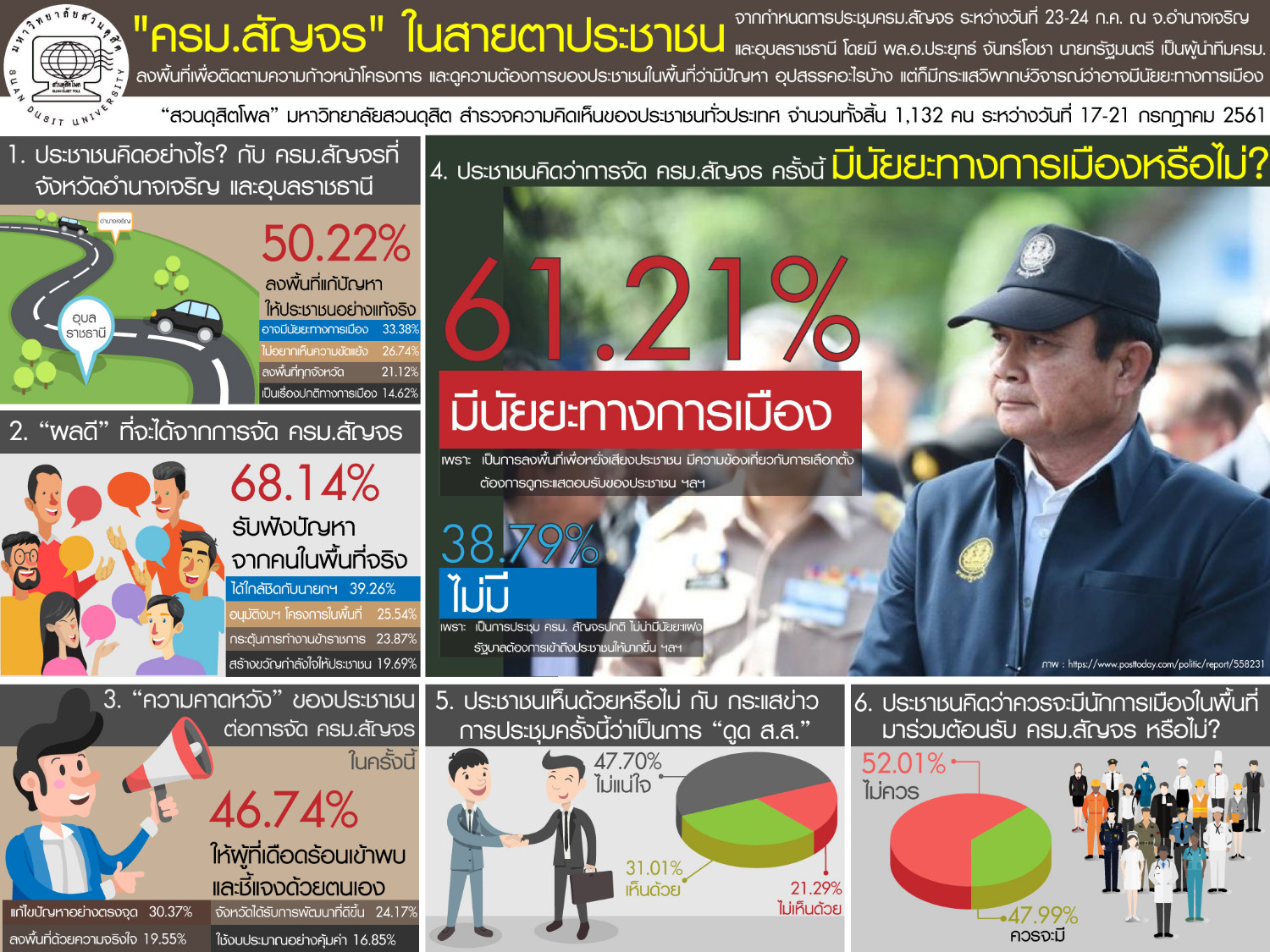 จากกำหนดการประชุมครม.สัญจร ระหว่างวันที่ 23-24 ก.ค. ณ จ.อำนาจเจริญและอุบลราชธานีโดยมีพล.อ.ประยุทธ์ จันทร์โอชา นายกรัฐมนตรีเป็นผู้นำทีมครม. ลงพื้นที่เพื่อติดตามความก้าวหน้าโครงการและดูความต้องการของประชาชนในพื้นที่ว่ามีปัญหา อุปสรรคอะไรบ้าง แต่ก็มีกระแสวิพากษ์วิจารณ์ว่าอาจมีนัยยะทางการเมือง เพื่อเป็นการสะท้อนความคิดเห็นของประชาชนที่มีต่อ ครม.สัญจรในครั้งนี้ “สวนดุสิตโพล” มหาวิทยาลัยสวนดุสิต ได้สำรวจความคิดเห็นของประชาชนทั่วประเทศ จำนวนทั้งสิ้น 1,132 คน ระหว่างวันที่17-21 กรกฎาคม 2561 สรุปผลได้ ดังนี้