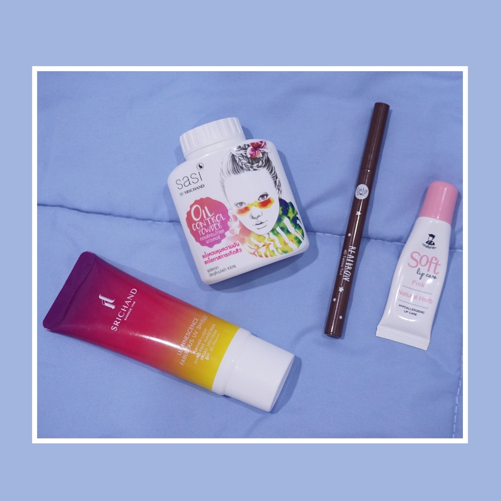 สุดท้ายคือเซ็ตเครื่องสำอาง ปูไม่ค่อยเน้นสวยเท่าไหร่ เอาแค่แบบเจอผู้คนได้ก็พอแล้ว พกไปแค่ 4 ตัวนี้เองค่ะ ลิปมันของเภสัช / ครีมกันแดดของศรีจันทร์ / แป้งปูก็ใช้แป้งฝุ่นของศรีจันทร์ค่ะ แป้งของเค้าเนื้อบางเบาดี ทาแล้วไม่เป็นคราบ พกพาง่ายค่ะ เนื้อแป้งเป็นสีขาวๆ ตัวนี้ช่วยคุมมันระหว่างวันได้ดีด้วยนะ เหมาะกับทำงานเหนื่อยโฮกกกของเรา / และก็ดินสอเขียนคิ้วค่ะ Real Brow 4D tattoo tint ของ Cathy Dall เขียนง่าย ไวด้วย ให้คิ้วแบบที่เป็นธรรมชาติสุดๆเลยค่า เพราะเราจะไม่เขียนคิ้วก็ไม่ได้ เดี๋ยวเพื่อนๆที่กองถ่ายจะตกใจ
