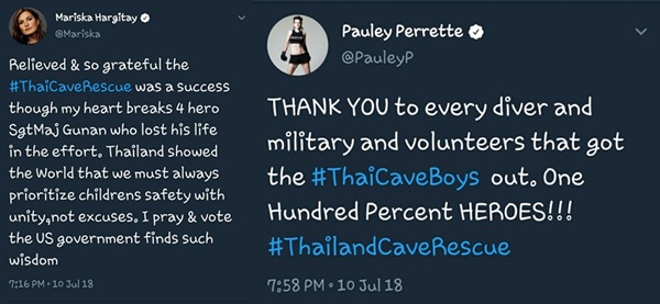 "โล่งใจและซาบซึ้งขอบคุณสุดๆที่ช่วยน้องหมูป่าออกมาได้สำเร็จค่ะ แม้จะต้องหัวใจสลายกับการสูญเสียจ่ากุนัน ประเทศไทยได้แสดงให้โลกเห็นว่าความปลอดภัยของเด็กสำคัญกว่าการหาข้อแก้ตัว ฉันขอสวดมนต์และโหวตให้รัฐบาลสหรัฐได้ค้นพบปัญญาแบบนี้บ้างเถอะ"