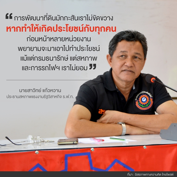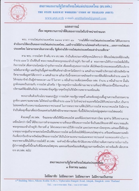 ด้วยเหตุนี้ สร.รฟท. จึงแถลงมาเพื่อให้พี่น้องคนรถไฟและพี่น้องประชาชนชาวไทยทุกท่าน ได้ทราบความเคลื่อนไหวว่า บัดนี้ได้มีขบวนการทำลายและพยายามที่จะเอาที่ดินของการรถไฟฯ ซึ่งเป็นสมบัติของชาติ ที่พระบาทสมเด็จพระจุลจอมเกล้าเจ้าอยู่หัว รัชกาลที่ 5 ได้ทรงพระราชทานไว้ให้การรถไฟฯ และประชาชนชาวไทยทุกคน แต่ขณะนี้ได้มีกลุ่มทุกบางกลุ่มเข้ามาหาผลประโยชน์ในที่ดินของการรถไฟ