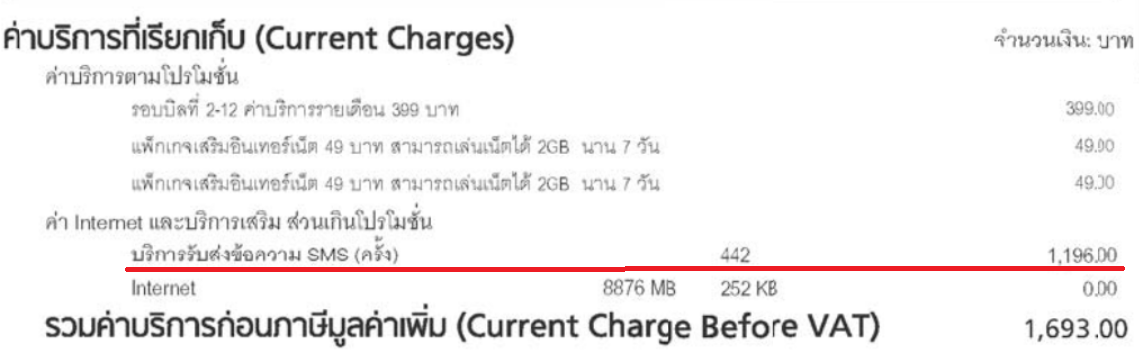 ค่าบริการข้อความ 442 ครั้ง คิดเป็นเงิน 1xxx บาท