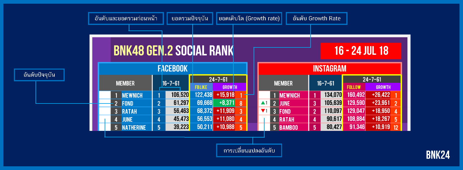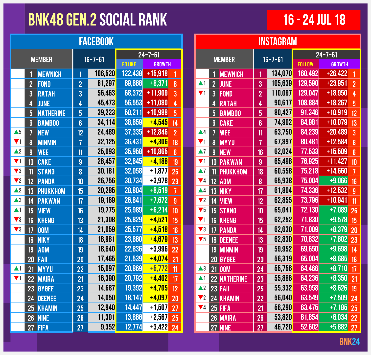 สถิติยอดติดตาม Facebook และ IG ของ รุ่น 2 ตั้งแต่วันที่ 16-24 กค 61 และอื่นๆ