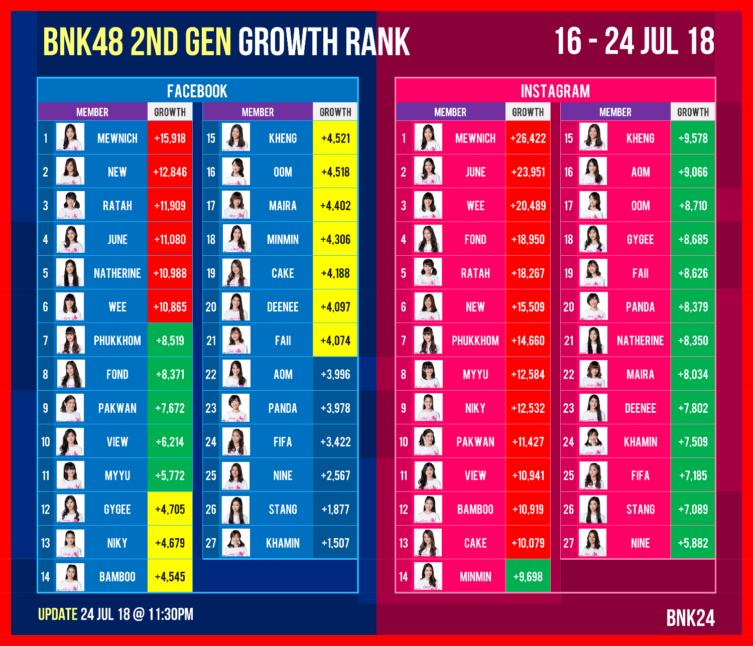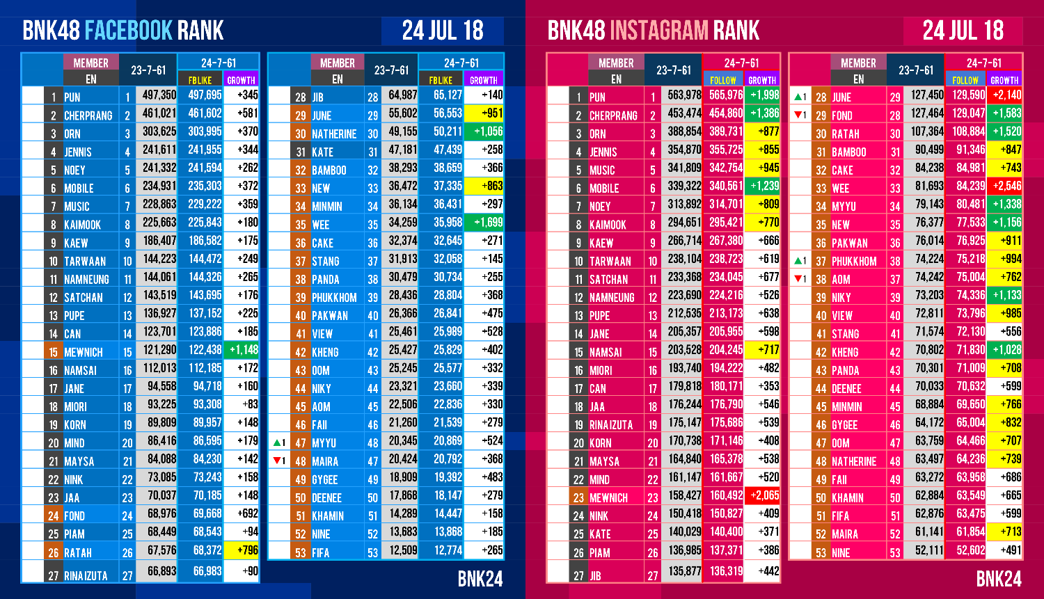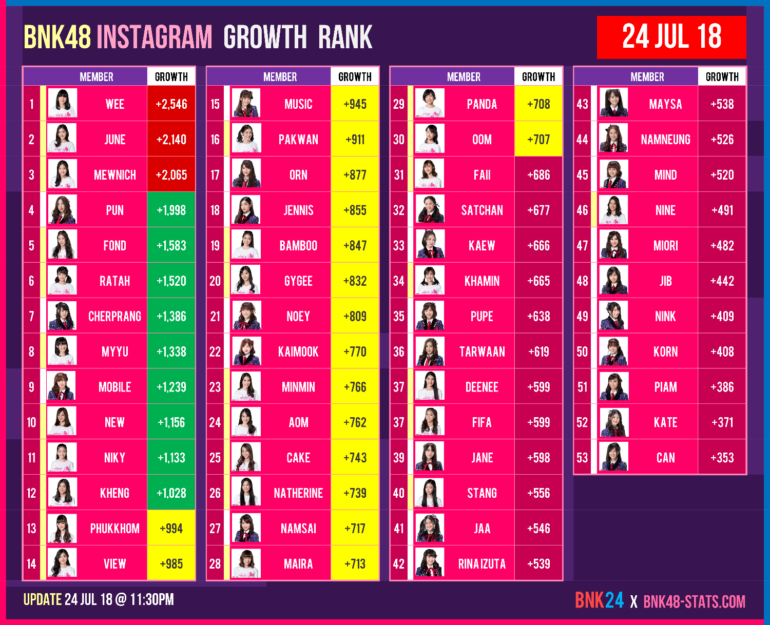 อันดับยอดเติบโต Instagram ทั้งวงประจำวันที่ 24 กค 61