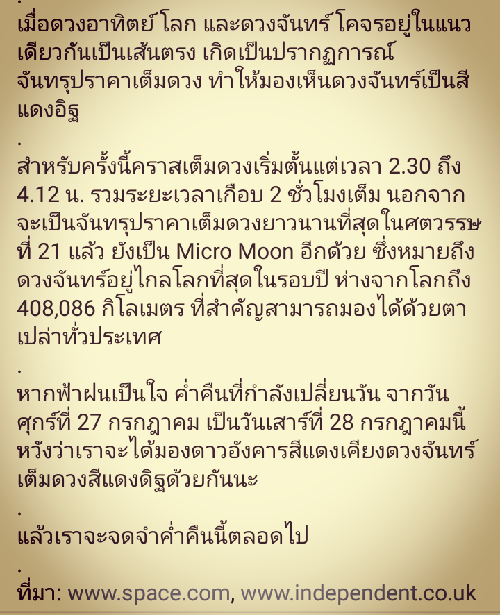 สวัสดีครับ ผม Partita ขอเสนอข่าวปรากฏการณ์ดาราศาสตร์สั้น ๆ ที่จะเกิดขึ้นในคืนวันนี้ครับ เนื้อหาข่าวผมนำมาจาก - http://thaiastro.nectec.or.th/skyevent/article/lunareclipse-201808/ - http://www.narit.o