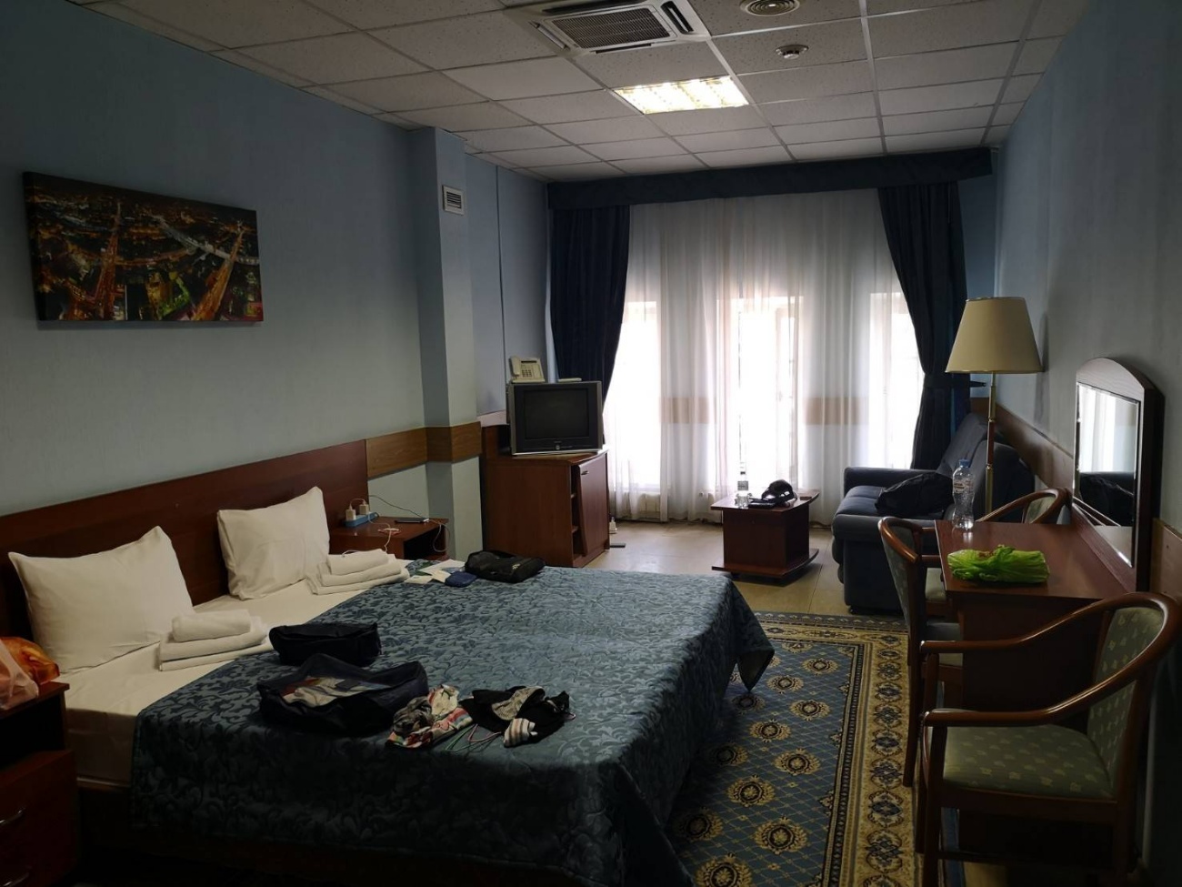 วันนี้พักโรงแรมที่อยู่บนสถานี Metro นี้เลยครับ ชื่อว่า Gorod Hotel Belorusskiy ราคา 3,ุ600 รูเบิ้ล/คืน (1,800 บ.) จองไว้คืนเดียว เนื่องจากวันพรุ่งนี้ ต้องขึ้นเครื่องบินไปเมือง Sochi โรงแรมนี้มี ข้อดี คือ เดินทางสะดวกมาก ลงมาจากห้องพักก็เป็นสถานีรถไฟและ สถานีรถด่วน AeroExpress ไปสนามบิน SVO ในส่วนของห้องพัก ถือว่าสัดส่วนกำลังดี เตียงใหญ่ เฟอร์เยอะ แต่เป็นห้องน้ำรวมนะครับ 2 ห้องนอน ใช้ห้องน้ำรวมกัน 1 ห้องซึ่งก็ไม่มีปัญหาอะไร ข้อเสีย คือ ไม่มีลิฟท์ ถ้ามีกระเป๋าเดินทางใบใหญ่จะลำบากเอาเรื่องเลย เวลาเข้าออกต้องผ่านหน้าทางเข้าสถานีรถไฟ ต้องสแกนกระเป๋าทุกครั้ง ซึ่งไม่เหมาะกับคนพกของเยอะๆ แต่ที่แย่มากๆ คือ ห้องที่ผมนอน จะมีกลิ่นเหม็นเขียวแปลกๆ เหม็นแบบพลาสติกไหม้ๆ บอกไม่ถูกเลยครับ พยายามหาต้นตอว่ามาจากไหน ก็หาไม่เจอ ดีว่าใช้นอนแค่คืนเดียว ไม่งั้นคงได้เวียนหัวกับกลิ่นนี้ไปตลอดทริปแน่ๆ