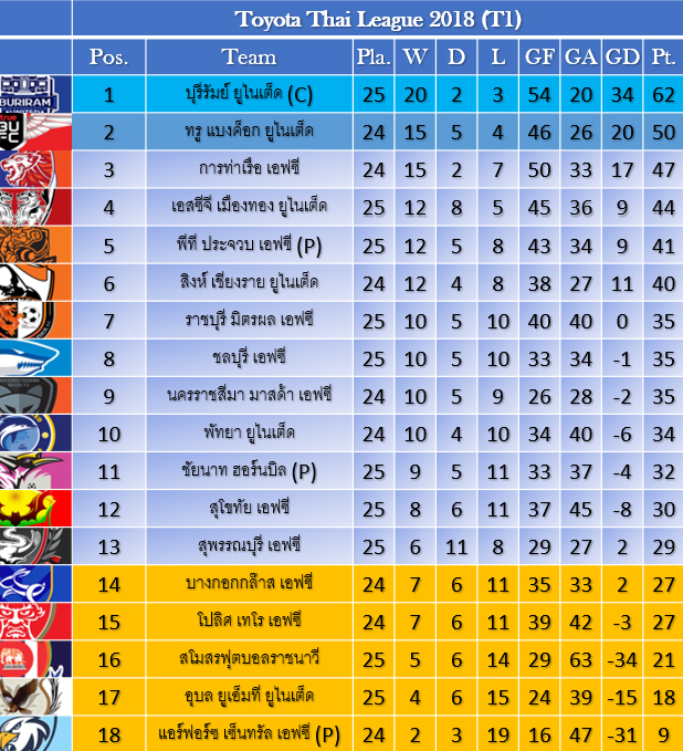 สรุปผลฟุตบอล ไทยลีก 2018 ประจำวันเสาร์ที่ 21 กรกฏาคม 2561 พร้อมตารางคะแนน