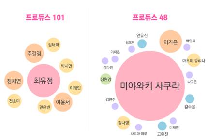 ใน Produce 101 จากข้อมูล sns จะมีตัวเต็งอย่างจอโซมี และคิมเซจองติด top2 อยู่เสนอตั้งแต่เริ่มรายการ