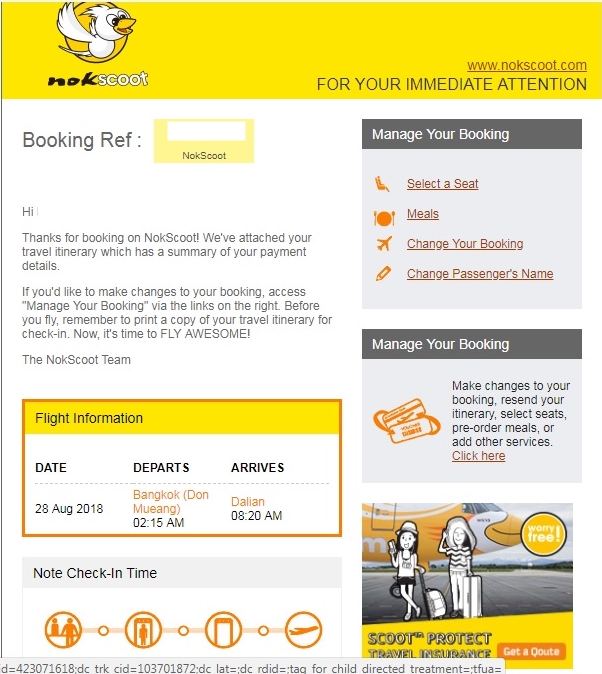 เห็นเมื่อสองอาทิตย์ก่อน ออกโปรไปต้าเหลียน ราคาดีงาม บิสเนสเพียงหกพันนิดๆช้าอยู่ใย รีบจัดไปในทันใด พอวันนี้ เห็นน้องบอกว่า ยกเลิกไฟลท์บินทั้งหมด ก็ยังไม่เชื่อ เพราะยังไม่ได้ Email จากทาง Nok Scoot เลยรีบโทรไปหา Call Center เช็คว่า จริงเท็จแค่ไหน พนักงานแจ้งว่า ยกเลิกบินจริงๆ ตั้งแต่ สค กย หลังจากนั้น ไม่สามารถบอกได้จะมาบินอีกไหม เลยถามพนักงานว่า ถ้าจะยกเลิกบินแล้วมาออกโปรทำไม พนักงานก็เงียบไป เห็นสายการบินนี้มีปัญหาบ่อยๆ แต่เคยบินมาสองสามครั้งก็ไม่เคยเจอกับตัว มารอบนี้ จัดเต็มจริงๆ คงต้องเลิกคบซะแล้วสายการบินนี้
