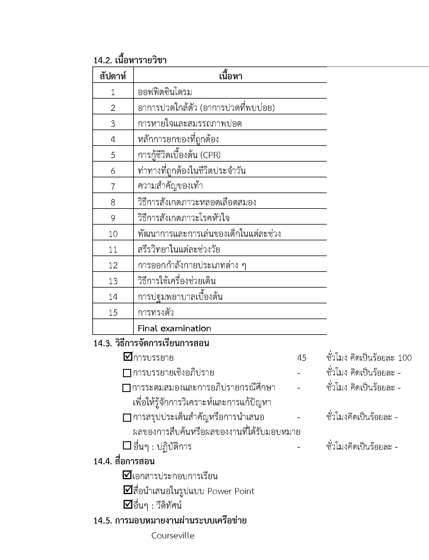 เรื่องที่สอน เช่น ออฟฟิศซินโดรม (โรคหรืออาการปวดจากการทำงาน การนั่งที่ไม่ถูกต้อง) อาการปวดใกล้ตัว(ปวดหัว ไหล่ หลัง สะโพก ขา)