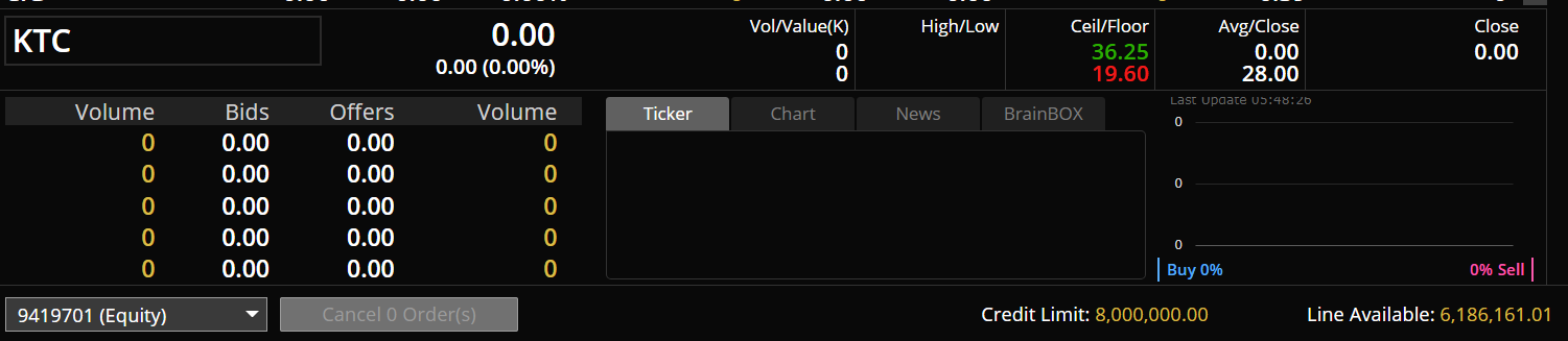 ณ 26/7/2561 ตัวแม่ปิดที่ 28.00 ในวันนี้วันสุดท้ายซื้อขาย 31/7/2561 เลวร้ายสุดๆทุบอย่างรุนแรงลงมา floor ที่ 19.60 บาท ก็ไม่ช่วยอะไรได้ จะไม่มี Cash Settlement จ่ายให้ผู้มี ktc24p1807a หลังปิดตลาด 31/7/2561 ถึงกระนั้นจะไม่แปลกปลาด MM หรือ จ้าว เช้ามาเล่นช่วงเปิดตลาด หลอกให้เม่าที่รู้เท่าไม่ถึงกาลหลงเข้าเพราะเห็นว่าถูกเหลือเกินที่จะห้ามใจ หวังช่องเดียวจะมีกำไรร่วมๆ 50% อย่างง่ายๆ รู้ตัวก็สายเกินแก้เงินเสียใจ ได่แต่บอกตัวเอง "กรูไม่น่าเลย"