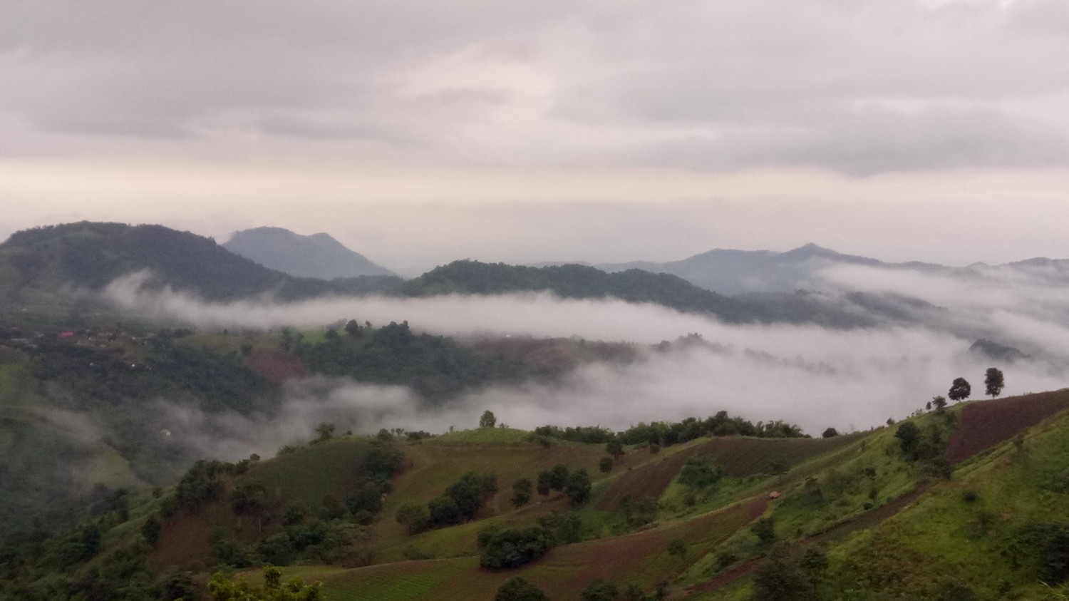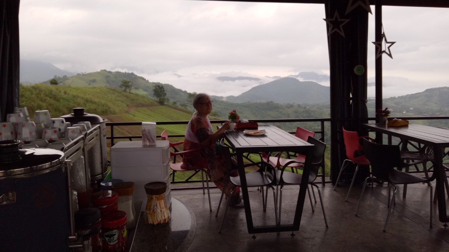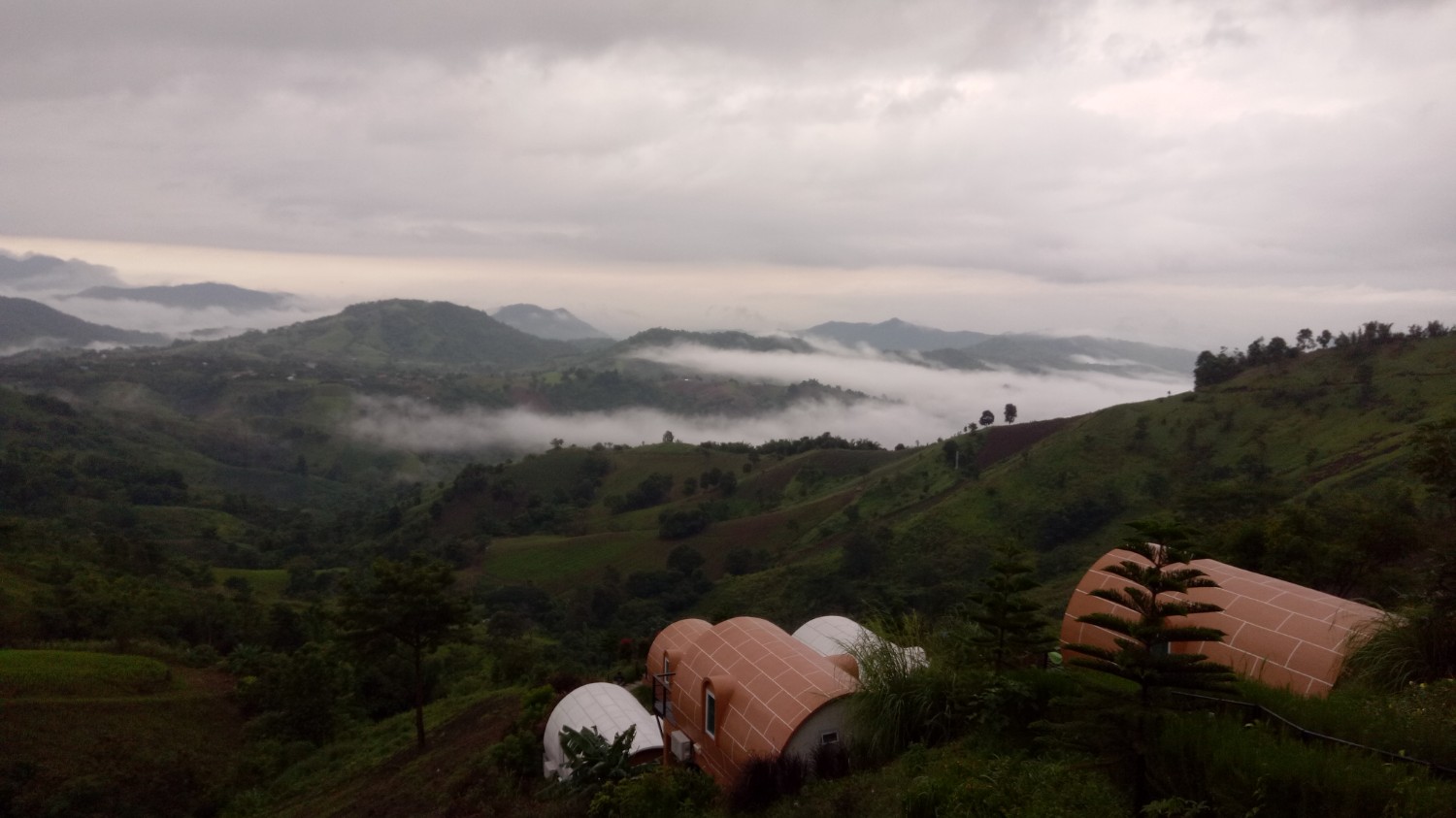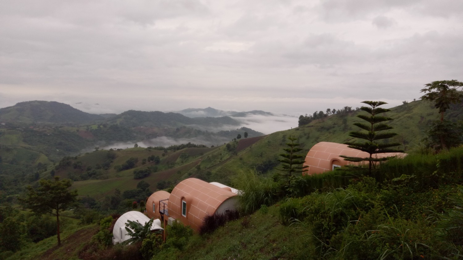 เราติดต่อไปที่รีสอร์ท จนท.เขาขับรถมานำรถเราไปค่ะ ถูกแม่บ่น และ เคือง ว่าใครแนะนำมา คิดว่าจะงานเข้าซะแล้ว มาจอดรถไว้ที่จุดพักรถ มีรถ 4WD ของรีสอร์ทรับขึ้นไปค่ะ เพราะทางชันเป็นลูกรังแถมฝนตกทางแฉะเป็นโคลนเลน เสี่ยงต่อการติดหล่มมาก มีแต่รถไถ กับ 4WD ที่ขึ้นได้ในช่วงนี้ เหลือบตาไปมองหน้าแม่แล้ว ไม่สบรมณ์ เอาซะเลย พอขึ้นไปถึงด้านบน อากาศดีสุดๆ เหมือนหลุดจากพันธนาการทุกอย่างไปอยู่อีกโลกหนึ่ง พอสั่งข้าวเที่ยงมาทาน ... ผ่านค่ะ เข็มอารมณ์ของนาง กลับมาอยู่ที่ 0 อีกครั้ง พอเข้าห้องพัก เพิ่มคะแนนในแดนบวก แล้วค่ะ เราพักกัน 2 คืน ตอนกลางคืนฝนตก เช้าวันที่ 3 จึงมีทะเลหมอกจางๆอย่างที่เห็นในรูป ตอนบ่ายมีละอองฝนปรอยๆน้อยๆ แล้วหยุดพอแดดออกจึงมีรุ้งกินน้ำ ทั้งหมดถ่ายจากกล้องมือถือ