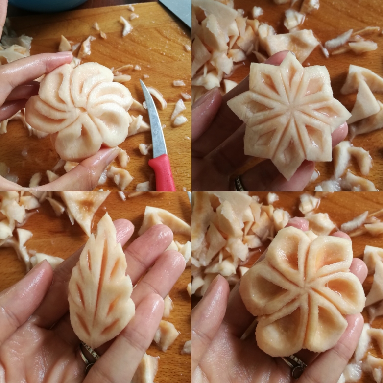 3.แบ่งกระท้อนออกเป็นชิ้นๆ แล้วค่อยๆใช้มีดเฉือนขอบๆออก ให้เป็นรูปทรงของดอกไม้ตามที่เราต้องการค่ะ