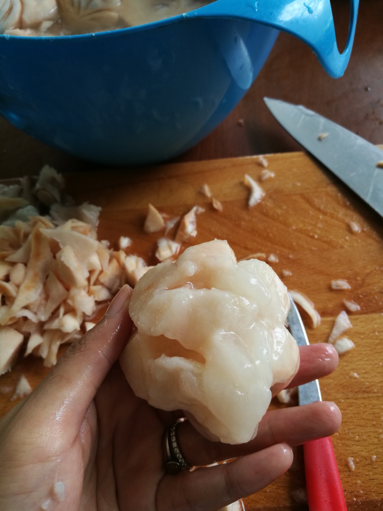 ปอกเสร็จแล้วรีบแช่น้ำเกลือไว้เลยค่ะ