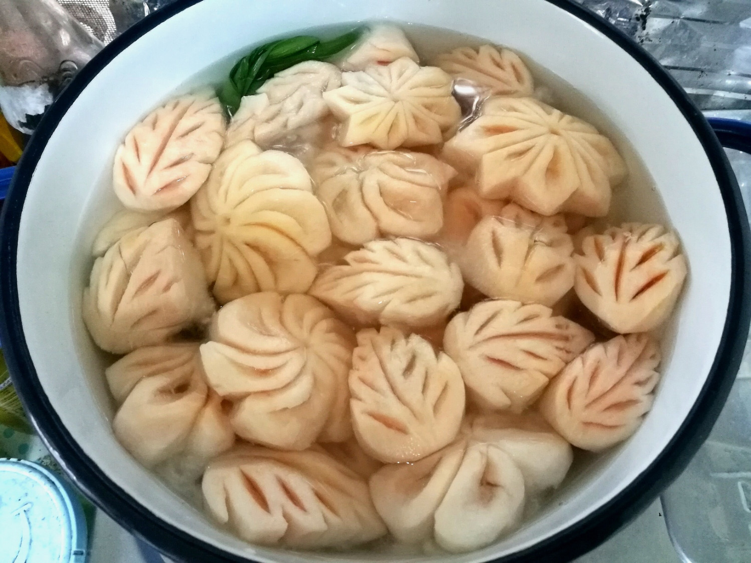 พอทำครบทุกชิ้นแล้ว ก็แช่น้ำเกลือไว้ก่อนค่ะ เตรียมทำน้ำเชื่อมกันต่อ