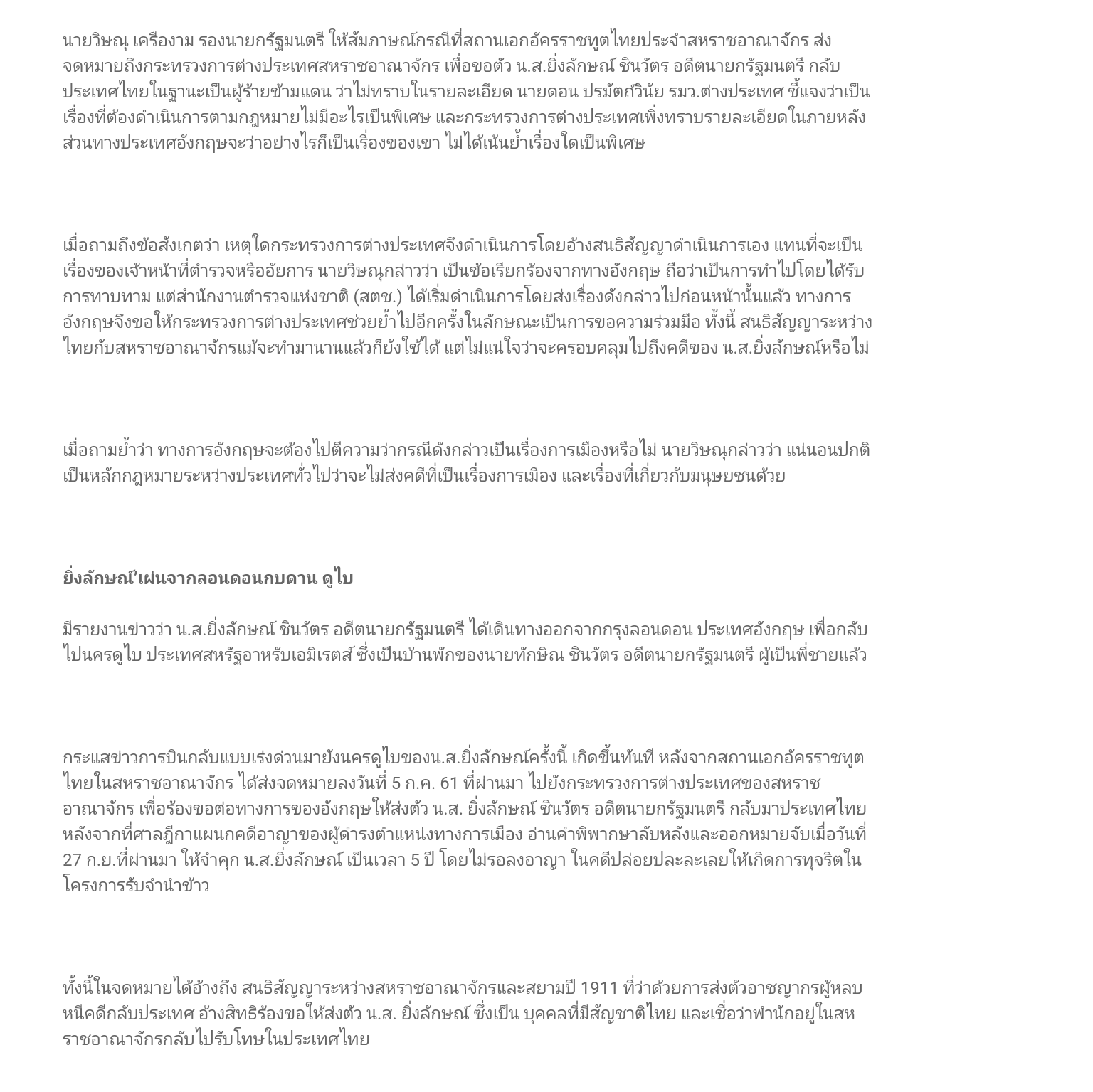 ทั้งนี้ในจดหมายได้อ้างถึง สนธิสัญญาระหว่างสหราชอาณาจักรและสยามปี 1911 ที่ว่าด้วยการส่งตัวอาชญากรผู้หลบหนีคดีกลับประเทศ อ้างสิทธิร้องขอให้ส่งตัว น.ส. ยิ่งลักษณ์ ซึ่งเป็น บุคคลที่มีสัญชาติไทย และเชื่อว่าพำนักอยู่ในสหราชอาณาจักรกลับไปรับโทษในประเทศไทย