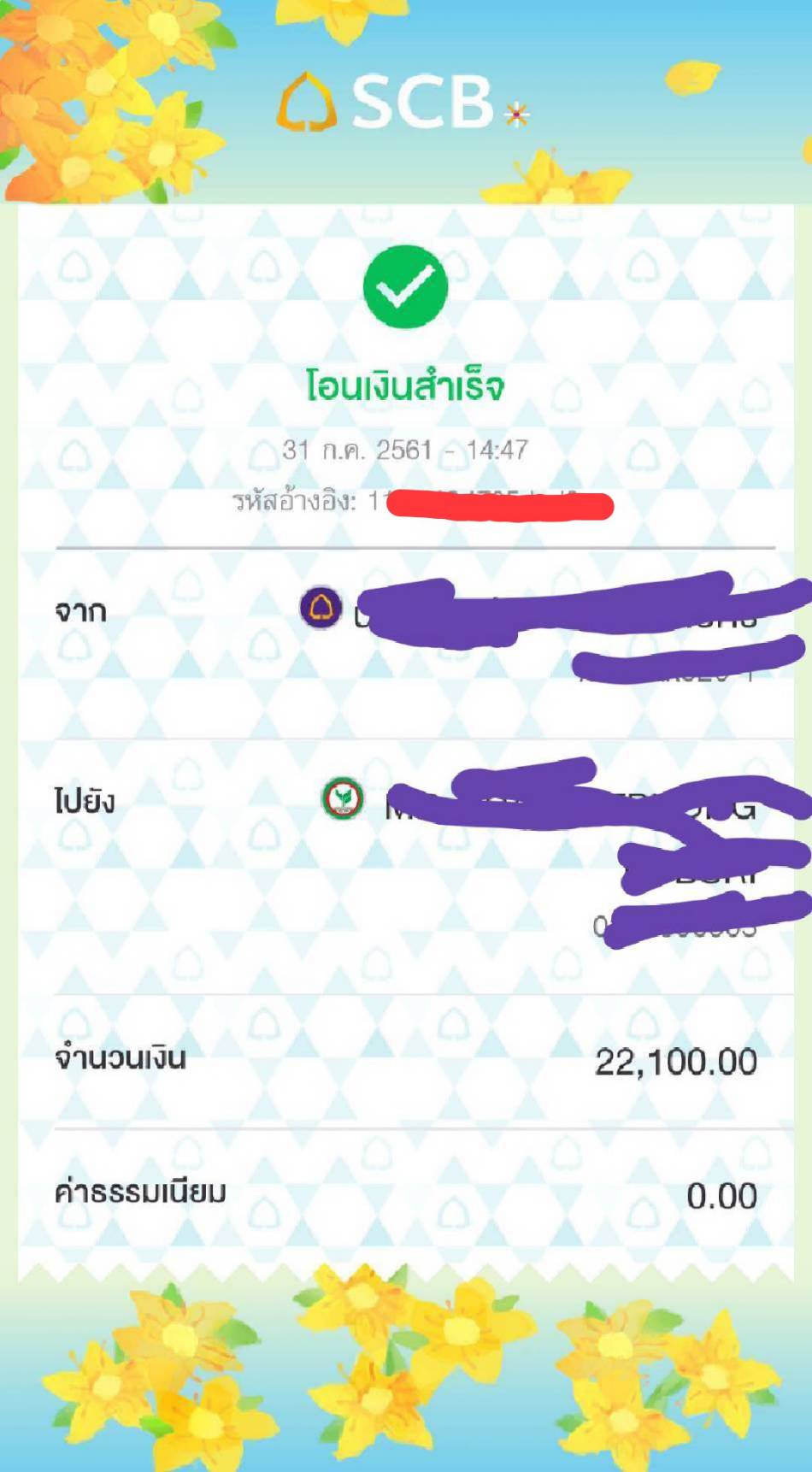 เรื่องเกิดมาจาก เราก็ทำการโอนเงินปกติ แต่มีเมื่อวันที่ 31 กค เวลา 14.47 น. เราได้โอนเงินจากSCB Easy App ยอด 22,100 (รูปแนบ เลขบั