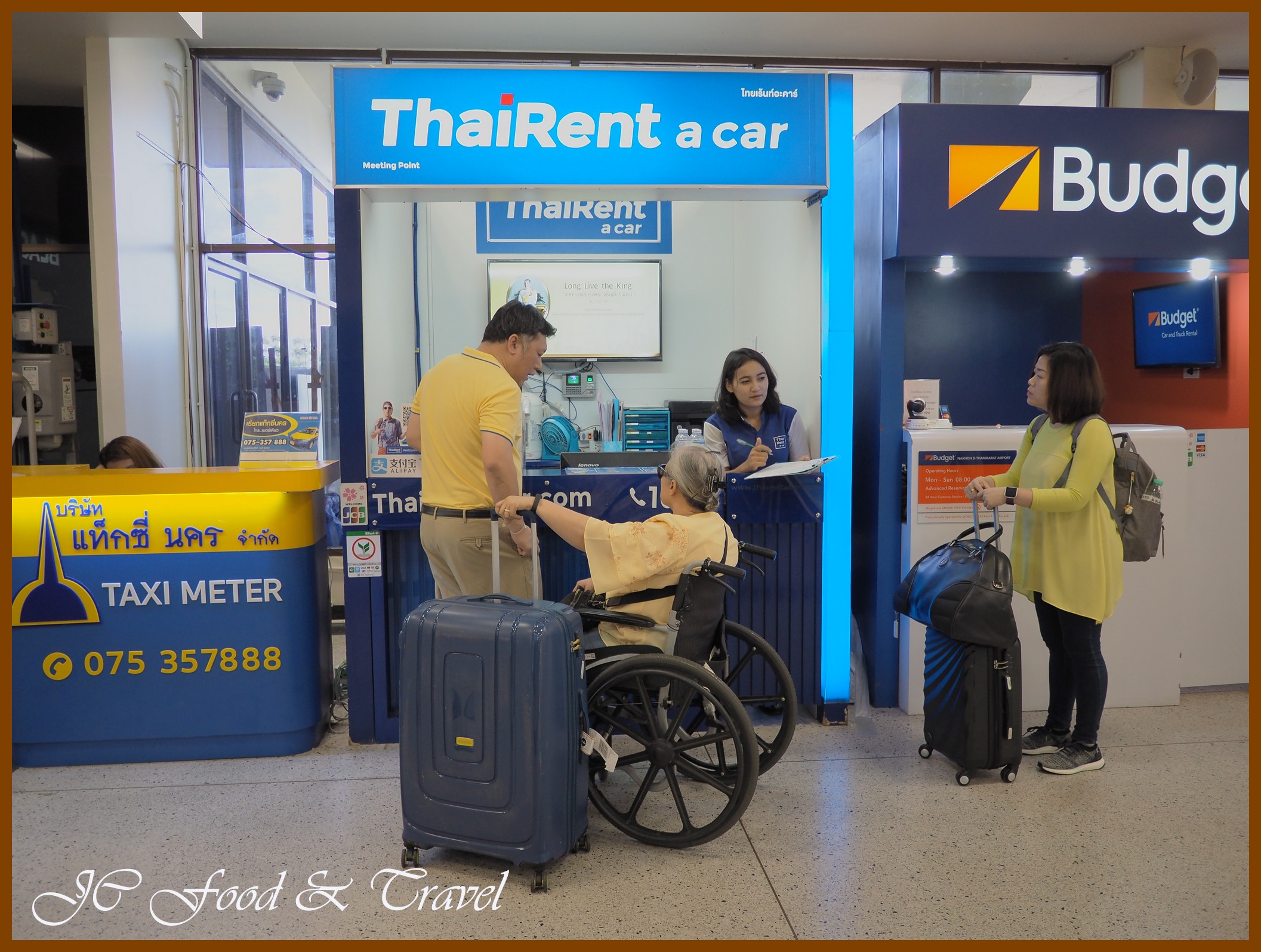 หลังจากลงมาเหยียบพื้นดิน เดินอีกไม่ไกลเราก็จะพบกับประตูทางเข้าสนามบินนครศรีธรรมราชครับ เดินเข้าไปก็จะพบกับสายพานลำเลียงกระเป๋าเดินทาง และก็ประตูทางออกไปสู่ด้านในของตัวอาคารสนามบินแล้วครับ ด้วยเป็นสนามบินขนาดไม่ใหญ่มาก ทำให้หาเคาน์เตอร์รถเช่าหลากหลายยี่ห้อ และรถแท๊กซี่ ได้ไม่ยากเลยครับ เดินออกมาก็เห็นแล้ว เราได้ทำการจองรถล่วงหน้า เป็นรถมิตซูบิชิ ปาเจโร กับทาง ThaiRent a car สาเหตุที่เลือกรถขนาดใหญ่เพราะเราต้องแบกกระเป๋าสัมภาระค่อนข้างเยอะ และมีรถเข็นผู้สูงอายุด้วย แต่เนื่องจากรถปาเจโรไม่ว่าง ทำให้เราได้เป็น โตโยต้า ฟอร์จูนเนอร์มาแทนครับ ก็ถือว่าเป็นรถในระดับเดียวกัน แค่คนละยี่ห้อ