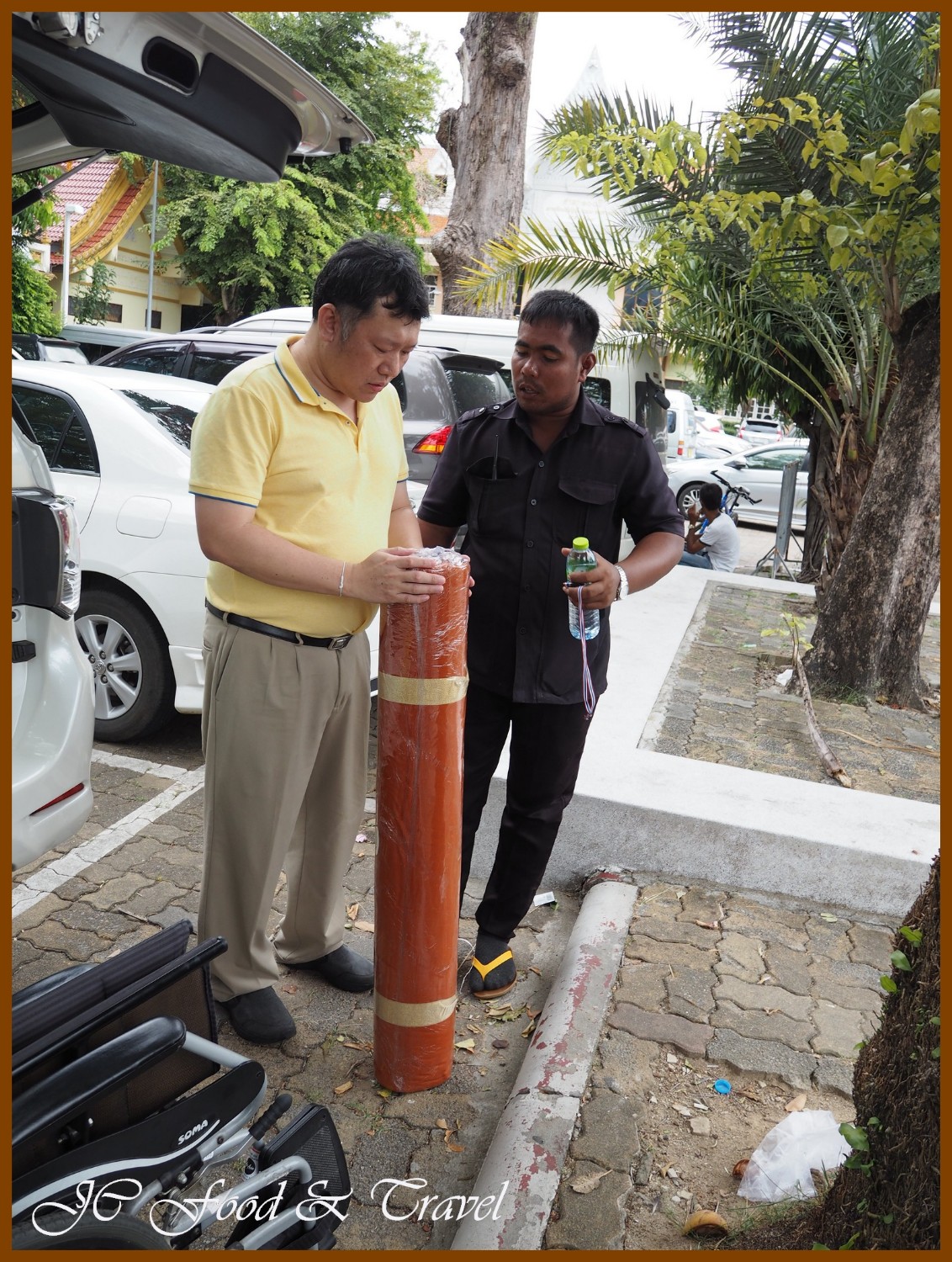 รถเช่าที่ได้รับมา สภาพรอบคันก็มีรอยบ้างตามการใช้งาน ด้านในก็สะอาดดีครับ น้องพนักงานกำชับมาแล้วว่า ห้ามสูบบุหรี่ภายในตัวรถ และห้ามนำทุเรียนขึ้นรถ ไม่อย่างนั้นจะมีค่าปรับ แต่ด้วยท่านแม่ผู้เคยชินกับการใช้รถตู้เป็นประจำ ทำให้ค่อนข้างลำบากเหมือนกัน กับการก้าวขึ้น-ลงรถ ที่มีที่ให้จับเพียงด้านบนอย่างเดียว สำหรับการเดินทาง ถึงแม้จะพยายามหาท่านั่งที่สบาย ด้วยความที่ไม่มีที่วางเท้าทำให้หนีไม่พ้นการต้องนั่งห้อยขา พวกเราจึงพยายามเดินทางแต่ละที่ ให้สั้นที่สุด เพื่อจะได้ไม่ต้องห้อยขานานๆ ให้เท้าบวมครับ ด้วยความที่เดินทางด้วยเครื่องบิน เราจึงตัดสินใจมาซื้อของสังฆทานกันที่นครศรีธรรมราช แต่ก็ติดถุงผ้าแพรสีทองมาจากกรุงเทพฯ หลังซื้อของเสร็จจึงแวะไปรับผ้าห่มพระธาตุและผ้าแพร 7 สี ที่โรงแรม และทำการจัดสังฆทานกันในห้องพัก