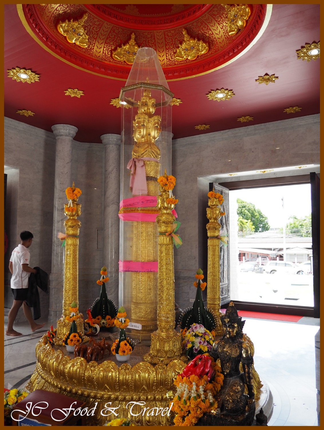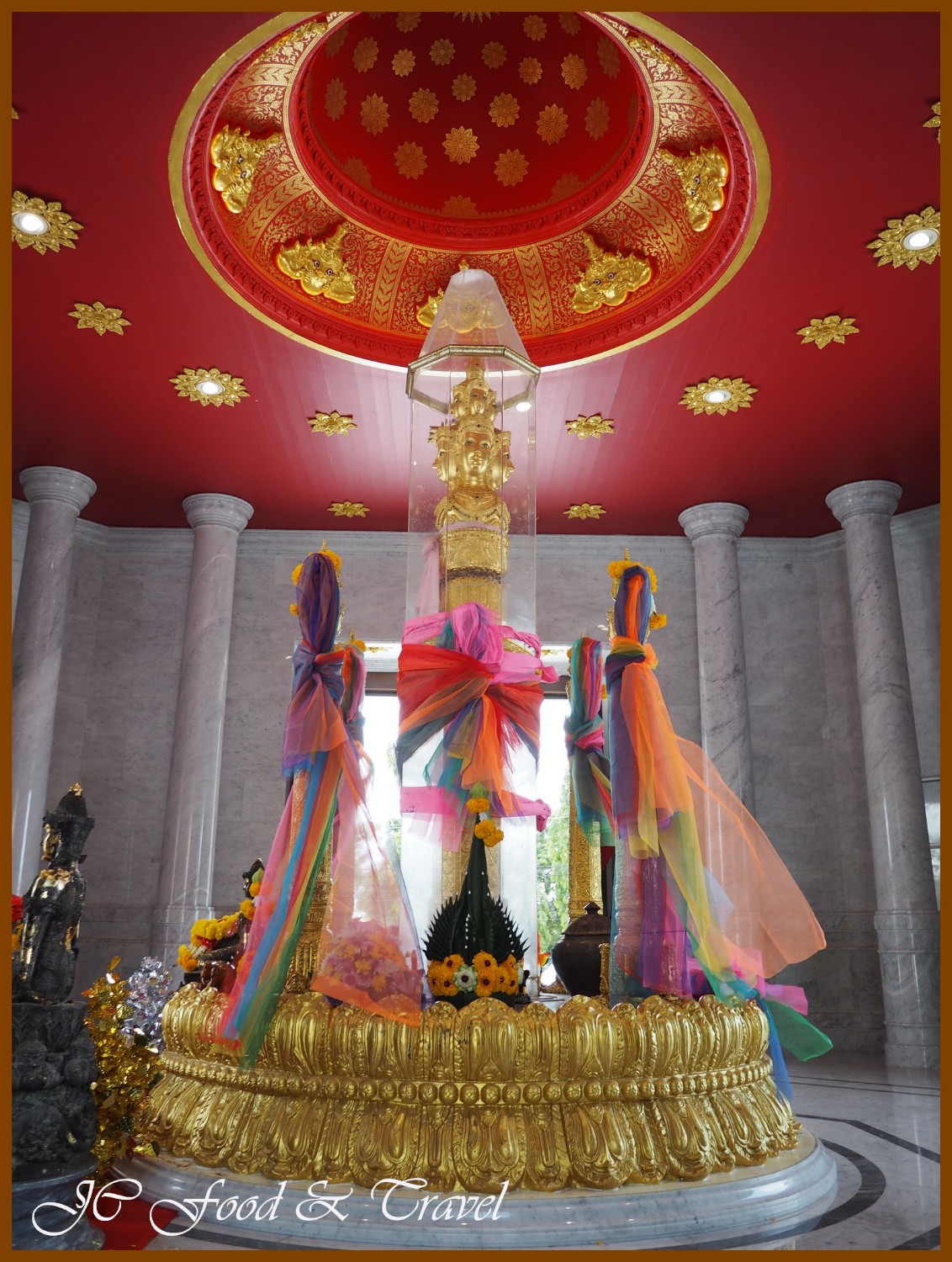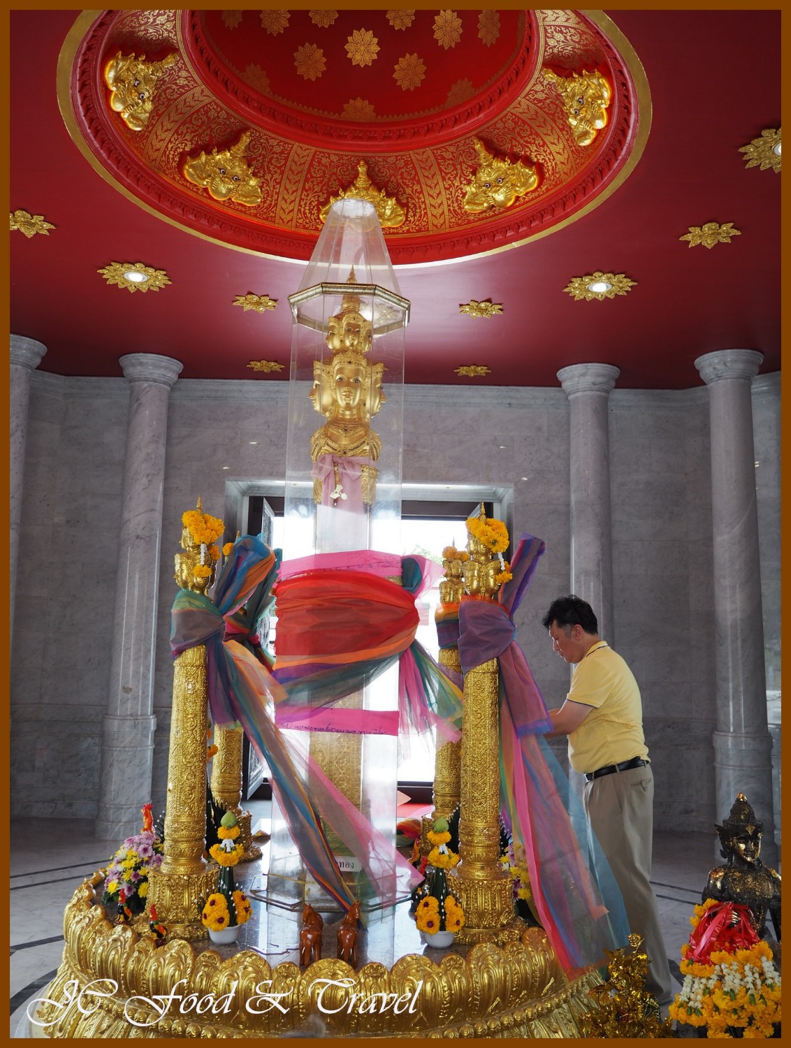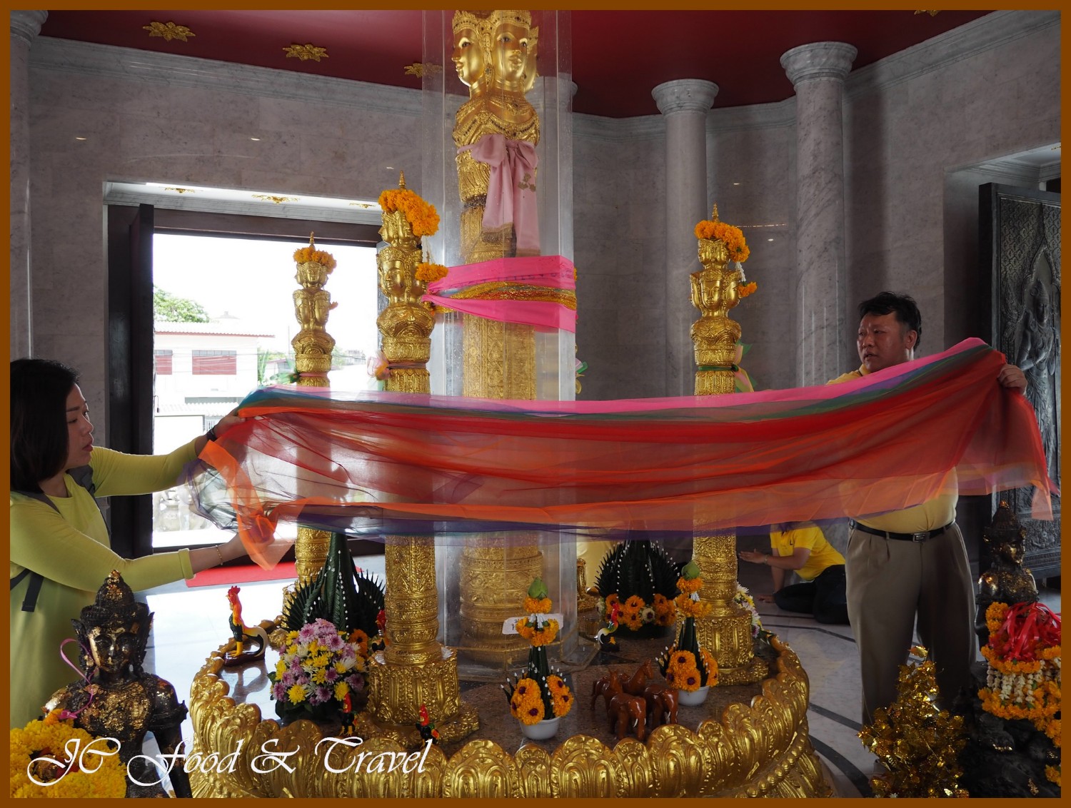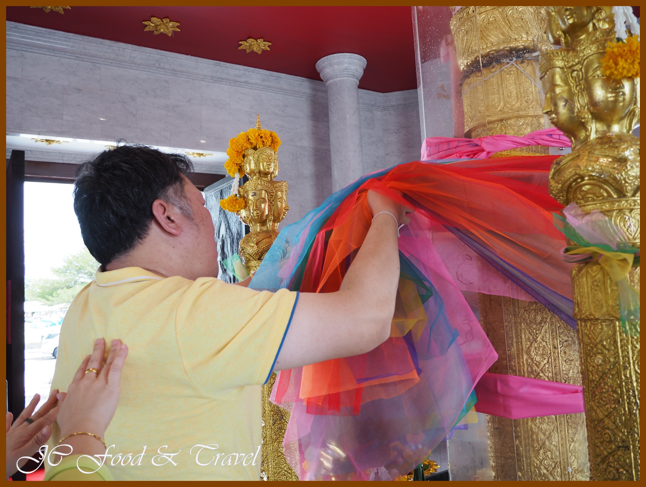 เมื่อก่อนที่เคยมา ด้านในจะมีโต๊ะไว้บริการ ให้เราบูชาผ้าแพร และมีเก้าอี้ให้ยืมนั่งได้ แต่ไปครั้งนี้ไม่มีให้บริการแล้วนะครับ แต่พวกเราก็เตรียมผ้าแพร 7 สี มาเองจากทางกรุงเทพฯอยู่แล้ว เมื่อไม่มีเก้าอี้ให้ท่านแม่นั่ง ก็เริ่มจากการยืนพิงเสา จากนั้นก็ลงนั่งกับพื้นครับ เพราะกว่าจะอธิษฐานกันเสร็จ และผูกผ้าแพรอีก น่าจะใช้เวลานานพอสมควร ก่อนจะทำการสิ่งใด มิสเตอร์ทีเดินไปสอบถามเจ้าหน้าที่ด้านนอกก่อนครับ ว่าสามารถผูกผ้าแพรที่เสาในศาลหลักเมืองได้เลยหรือไม่ เมื่อได้รับคำตอบว่า สามารถทำได้เลย ก็เริ่มการผูกผ้ากันครับ เริ่มจากจับชุดผ้า ให้เรียงครบ 7 สี