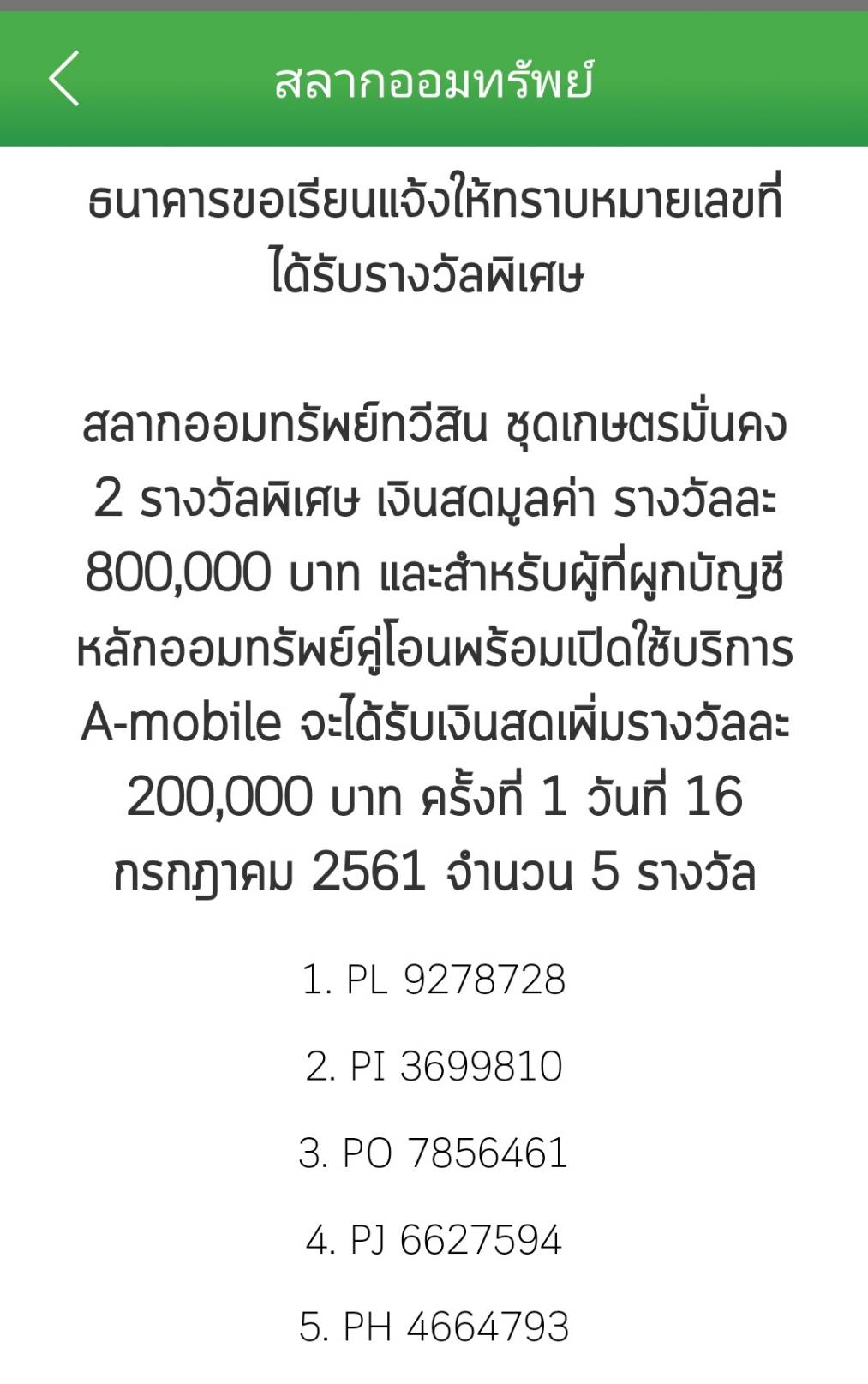 ประเทศ เราได้เลข PL 022xxxx แต่เมื่อไปตรวจดูรางวัลพิเศษที่ ออกงวดวันที่ 16 ก.ค. 61 กลับมี หมายเลข PL 927xxxx และ PO 785xxxx