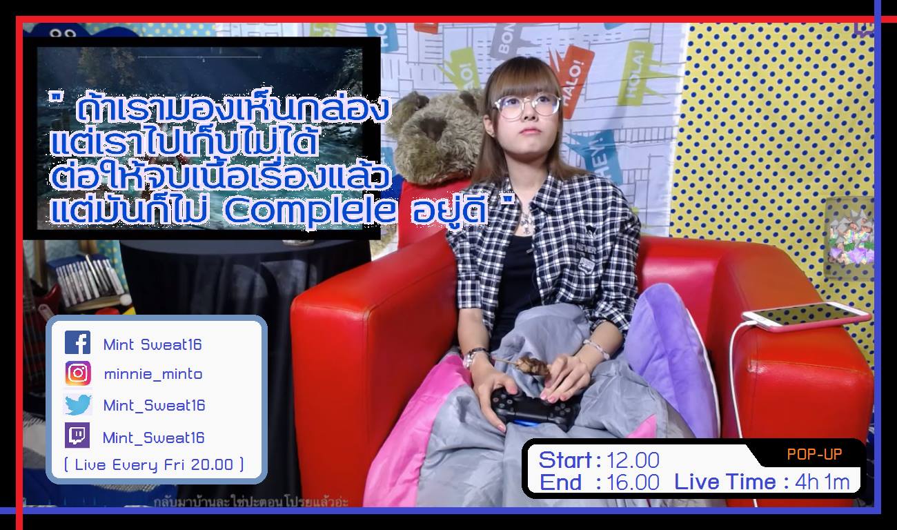 เท่าที่ดูไลฟ์วันนี้แล้ว ท่าทางจะยังอยู่กับเกม God of War อีกนานเลย ปกติหลังจบเนื้อเรื่องหลัก คนทั่วไปจะเล่นเพื่อเก็บเนื้อเรื่องรอง แต่คุณมิ้นนี่เล่นเพื่อเก็บกล่องครับ.. แล้วตอนเก็บกล่องดูจะไวกว่าตอนเก็บเควสด้วย...แต่นั่นแหละ เกมเมอร์ตัวจริงต้องเก็บรายละเอียดให้หมด จริงมั้ย!.. แต่ถึงอย่างนั้นก็ยังมีไปสู้กับบอสและไล่เก็บนกด้วยนะ แล้วก็ยังมีแผนที่ที่ยังไม่เปิดอีกเยอะ ยังไงก็เป็นเกมที่เล่นได้เรื่อยๆละนะ ก็เชียร์กันไปยาวๆกับเกมนี้