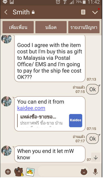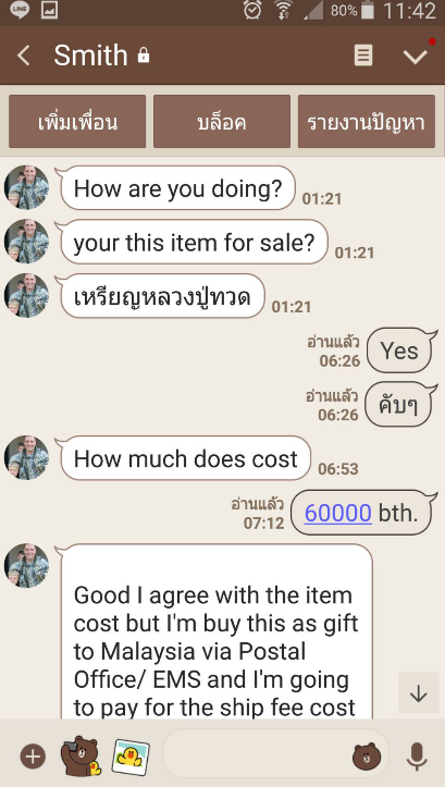 ก็มีชาวต่างชาติทัก line มา ว่าจะให้ปิดการขาย และไม่ต่อราคาใดๆ (ราคาประมาณ 5 หลักครับ) และบอกว่าจะซื้อไปเป็นของขวัญ