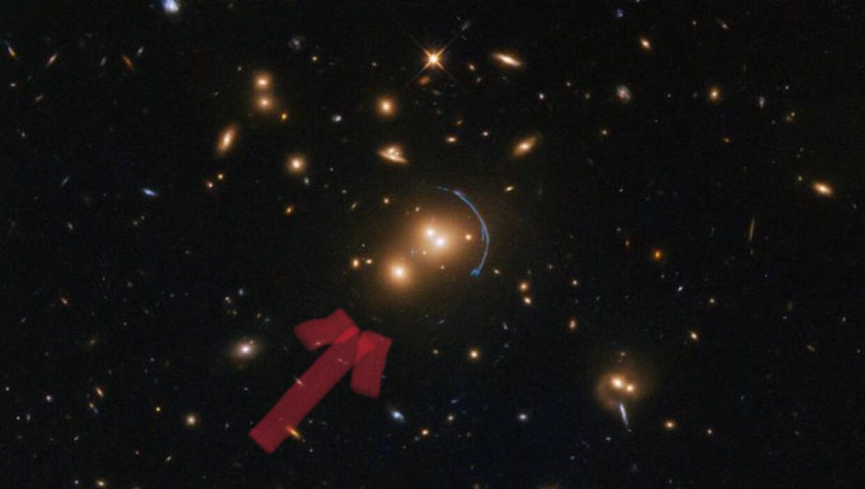 ภาพเมื่อไม่นานมานี้ กลุ่มดาวที่อยู่ในวง &ลูกศรแดง เหมือนมีเลนส์ใสมาบดบัง