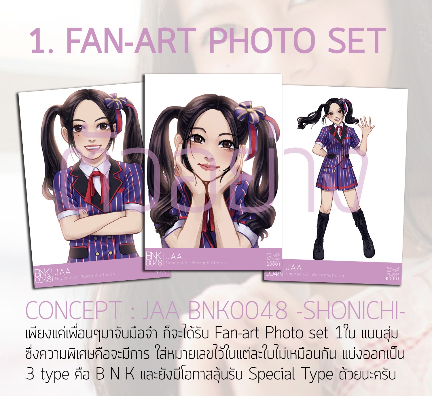หลังจากเริ่มทำแฟนอาร์ทกับเพื่อนของผม ผมก็วางคอนเซบคร่าวๆ ในการทำ และเลือกสไตล์ของรูปวาด เพื่อให้ดูเป็นการ์ตูนที่ถอดคาแรกเตอร์ของน้องออกมา มากกว่าที่จะเป็นเพียงแฟนอาร์ทเฉยๆ พอทำรูปออกมาเสร็จ รูปแรกแล้ว ก็อยากทำเพื่อให้เป็นที่ระลึกของ คนที่มาจับมือน้องที่เลนของน้อง จึงนำคอนเซบของโฟโตเซทของวงมาใช้ เลยทำให้เรามีรูปสามรูป ที่จะใช้แจกในงานจับมือ กว่าทุกอย่างจะเป็นรูปร่าง เราก็พร้อมที่จะแจกครั้งแรกในงานจับมือ ของซิงเกิ้ลที่ สาม Shonichi รูปคอนเซปในการทำคือ จ๋า ในชุด senbatsu ของซิงเกิ้ลที่สาม Shonichi - วันแรก หลังจากจบงานจับมือครั้งแรกของซิงเกิ้ล Shonichi ก็เริ่มทำเซทใหม่สำหรับการจับมือครั้งที่สอง จึงเริ่มทำเซทใหม่ขึ้นมาโดยให้สอดคล้องกับช่วงเวลาของน้อง ก็คือ set Party ga hajimaru yo