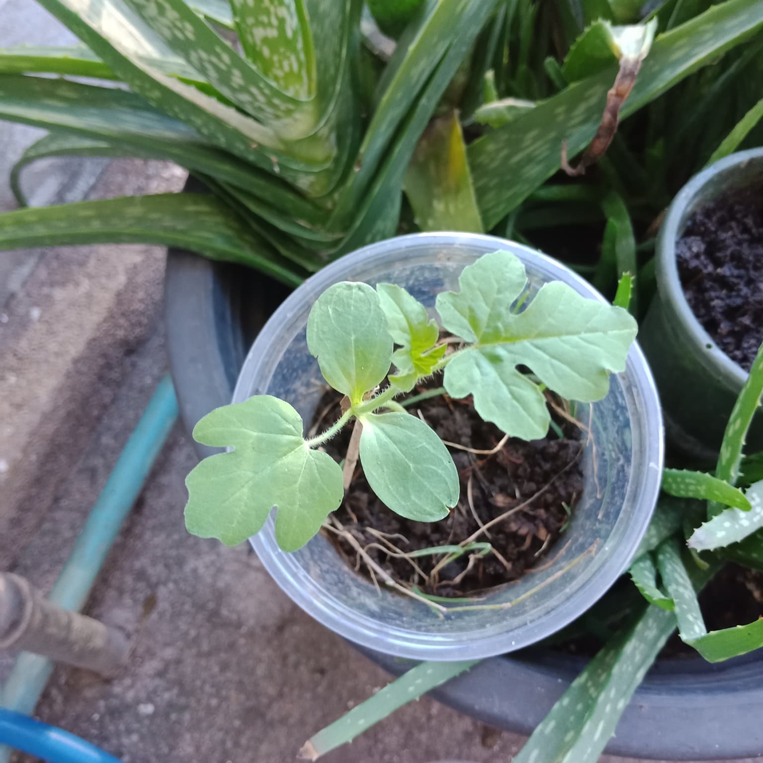 เลี้ยงไปซักหน่อยเริ่มมีใบแท้ ที่พวกแมลงชอบกินมาก เลยต้องหาแก้วน้ำพลาสติกที่เจาะรูมาคลุมถึงรอดค่ะ