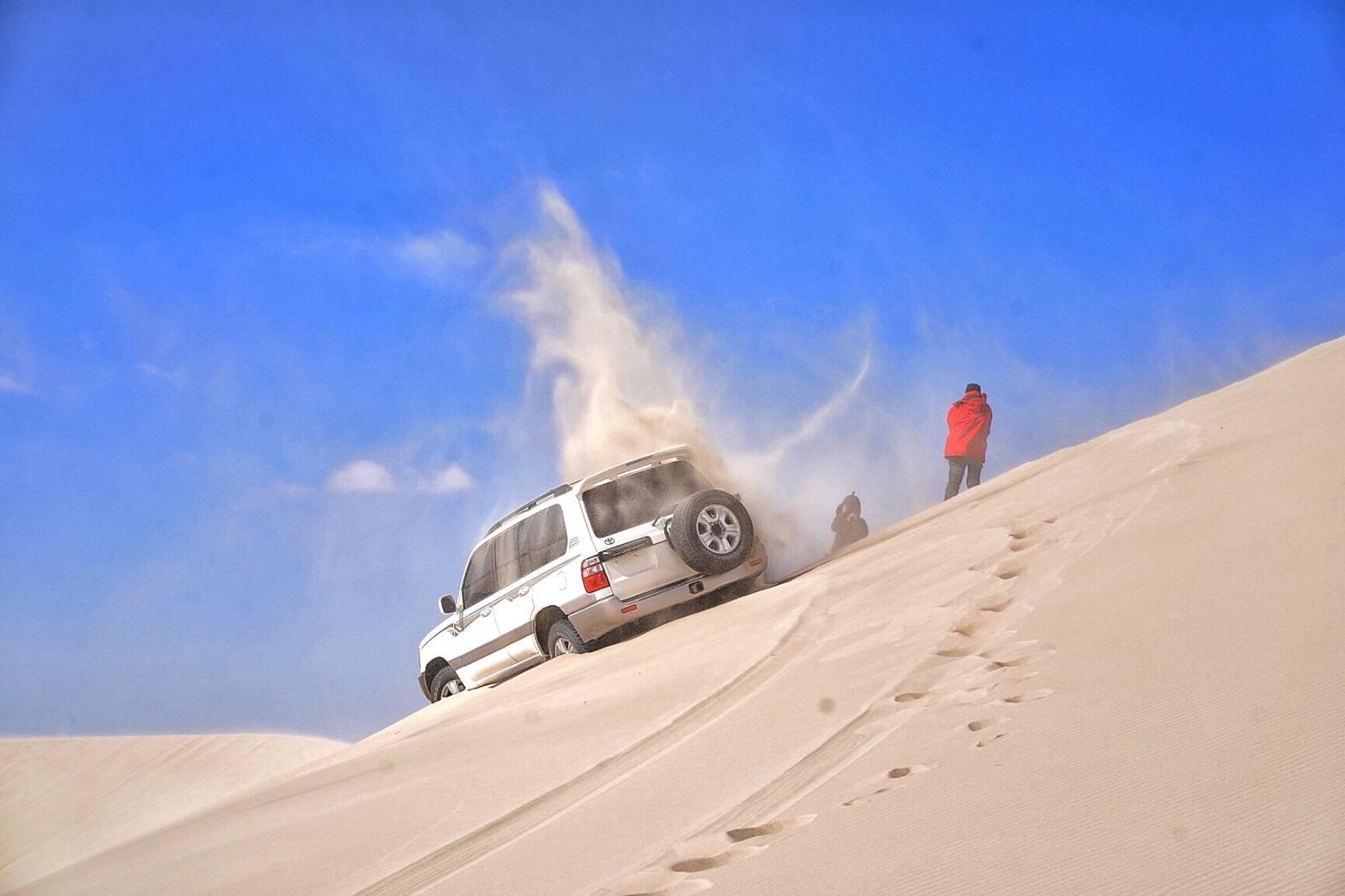 เวลาผ่านไปประมาณหนึ่งชั่วโมงกว่ารถกู้ภัยจะมาลากรถของเราได้ครับ แล้วผมก็นั่งรถออกไปจากทะเลทรายพร้อมกับคนขับที่คงจะรู้สึกเสียหน้านิดหน่อย พอออกไปถึงคนขับก็ไปคุยกับซินลี่ว่าจะขอขับพาไปอีกรอบ ซึ่งผมก็ตอบตกลงเพราะผมคิดว่าถ้าผมไม่ไปเค้าต้องโดนเจ้านายบ่นแน่ๆ ซึ่งคราวนี้คนขับพาไปรอบสั้นๆประมาณ 10 นาทีครับ แต่จัดเต็มทุกเนินทราย ผมว่าเค้าไม่เบารถเลยทีเดียว แต่จริงๆแล้วผมชอบนะถ้าไม่นับว่าตอนออกไปยืนในทะเลทรายมันหนาวไปหน่อย พอเสร็จเราก็ไปกินข้าวกัน เพื่อนของซินลี่ที่เป็นเจ้าของสัมปทานพื้นที่มาพาเราไปกินข้าวเองเลยครับ (บุคลิคประมาณยากูซ่าเลยครับไม่ค่อยเหมือนเจ้าพ่อเซี่ยงไฮ้เท่าไหร่) สำหรับผมอาหารมองโกเลียถือเป็นอาหารที่อร่อยเลยครับ อารมณ์จะเป็นอาหารตุ๋นๆ ย่างๆ ซึ่งผมชอบอยู่ละ พอกินข้าวเสร็จเราก็ไปกันต่อที่บริเวณที่เล่นเลื่อนหิมะ แต่เนื่องจากเราติดทะเลทรายอยู่นานพอไปถึงมันเลยค่ำไปหน่อยก็เลยอดเล่น แต่ก็ยังได้ไปถ่ายรูปมานิดหน่อยครับ
