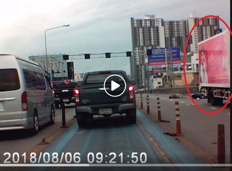 รถบรรทุกบริษัทไหนครับมองสติ๊กเกอร์ไม่ชัด ขับเร็วมากเบียน จยย ล้มแล้วหนี
