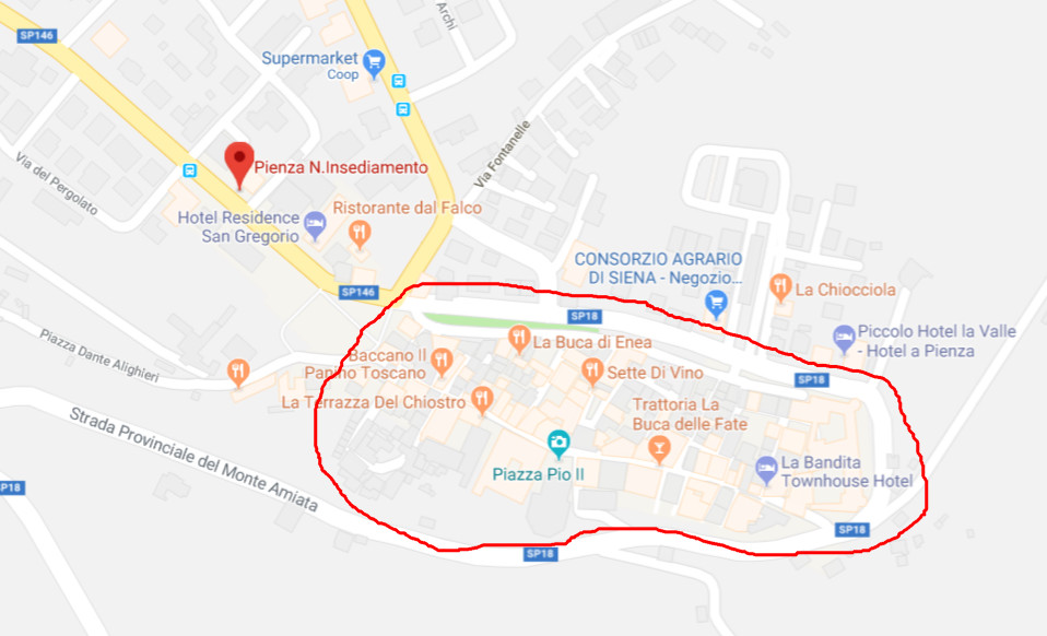 แผนที่เมือง Pienza ตรงในวงสีแดงคือบริเวณเมืองเก่า ส่วนตรงจุดที่ปักหมุดสีแดงคือตำแหน่งที่ตั้งของป้ายรถบัสครับ
