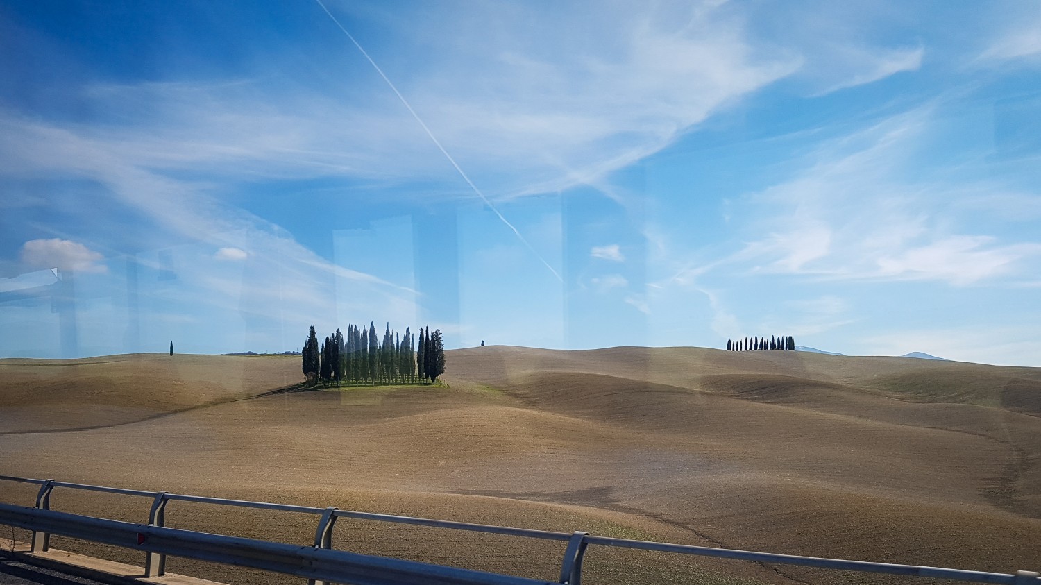 จากเมือง Pienza รถบัสจะวิ่งมาตามถนนสาย SP146 เส้นเดียวกันกับที่ผมไปขี่จักรยานมาตอนกระทู้ที่แล้ว แล้วพอมาถึงเมือง San Quirico d’Orcia รถจะเลี้ยวไปทางทิศตะวันตกและขับไปตามถนนสาย SR2 ซึ่งหลังจากที่ผ่านไปซักพักหนึ่ง รถก็จะขับผ่านมุมมหาชนที่โด่งดังมากที่สุดจุดหนึ่งใน Tuscany ซึ่งก็คือมุมของดงต้นสนไซเปรสที่ขึ้นอยู่รวมกันเป็นกระจุกเดียวท่ามกลางเนินเขาโล่งเตียนกว้างใหญ่ มุมๆนี้จะอยู่ทางซ้ายมือของรถครับ