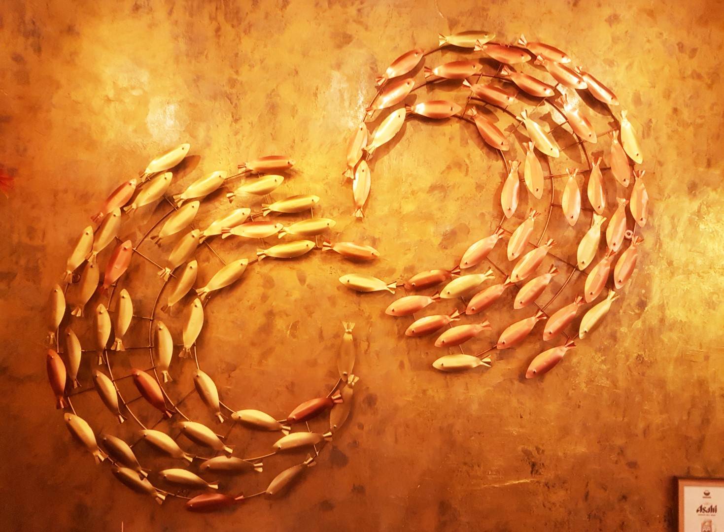 ภายในร้านตกแต่งด้วยโทนสีทองคำอร่ามตา บรรยากาศแบบฉบับภัตตาคารญี่ปุ่นหรูหรา รอบร้านประดับประดาด้วยโคมไฟและงานศิลปะทั้งจิตรกรรมและสถาปัตยกรรมเก๋ๆ ดูแล้วไม่รกและไม่โล่งจนเกินไป คลอเคล้าด้วยเสียงเพลงญี่ปุ่นสบายๆ เพิ่มอารมณ์สุนทรีในการทานอาหารเข้าไปอีกระดับ แต่อย่าถึงขั้นถามชื่อเพลงเลยนะ คือจ่าเองก็มิได้เป็นแฟนพันธุ์แท้เพลงเจแปนขนาดนั้น -_-