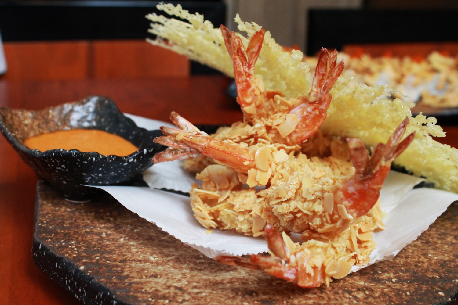 นี่คือเอบิอัลมอนด์ หรือแปลเป็นพี่ไทยได้ความหมายว่ากุ้งชุบอัลมอนด์สไลด์ทอดกรอบ นี่คือเมนูเฉพาะของทางร้านที่รังสรรขึ้นมาโดยเชฟหัวทันสมัย เพราะหากท่านไปเยือนร้านอาหารญี่ปุ่นทั่วไป ท่านจะได้มาแค่กุ้งเทมปุระทอดแสนธรรมดา แต่นี่เขานำอัลมอนด์มาใช้แทนแป้งเทมปุระ แล้วนำมาทอดไฟอ่อนๆช้าๆ เพื่อจะดึงสัมผัสที่กรุบกรอบของอัลมอนด์ออกมาไว้ด้านนอก ลองทานแล้วท่านจะได้พบกับมนต์เสน่ห์ของรสชาตินุ่มๆ หวานๆ ของเนื้อกุ้งตัวโตๆ ที่ซ่อนอยู่ด้านในความกรุบของอัลมอนด์ ยิ่งหากท่านนำเอบิอัลมอนด์ไปจิ้มกระหน่ำซ้ำด้วยซอสสูตรพิเศษของทางร้านอีกหนึ่งดอก ท่านจะได้รับรสเผ็ดหวานของซอสที่เข้ากันได้ดียิ่งกว่าคู่พระนางไหนๆ แล้วอย่าลืมใส่ใจกับเจ้าเส้นอินานิวะฟูฟ่องที่ถูกนำไปชุปแป้งทอดให้เหลืองกรอบเคี้ยวกรุบๆกันด้วยละ พอก่อน พูดแล้วหิว