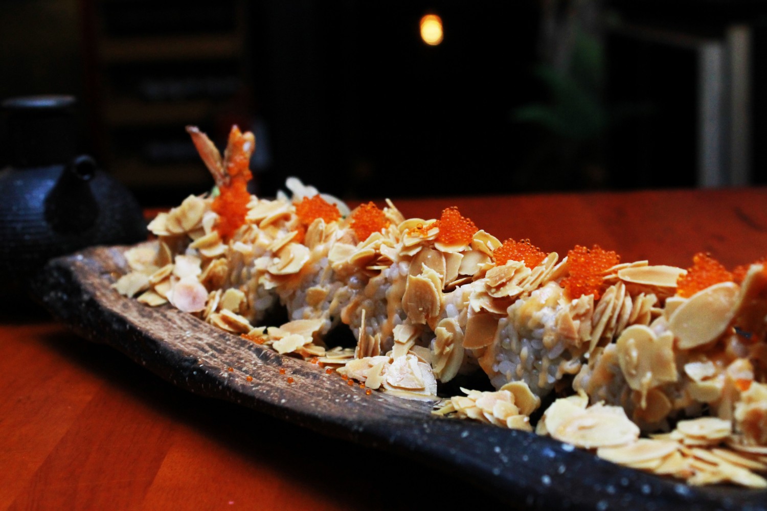 เมนูนี้ทางร้านบอกว่าเป็นเมนูใหม่ล่าสุดที่คิดค้นต่อยอดมาจากเมนูเอบิอัลมอนด์ข้างต้น ด้วยแนวคิดที่ว่าโรลเอบิทั่วไปจะโรยด้วยเทมปุระ แต่ทางร้านมีเมนูเอบิอัลมอนด์อยู่แล้วจึงลองเอาอัลมอนด์มาทำดูบ้าง และผลที่ออกมาคือเพอร์เฟ็ค สัมผัสแรกที่ได้รับคือความหนึบของข้าวและความกรอบของเอบิอัลมอนด์ที่ทาด้วยซอสมิโซะรสเข้มข้น ผสานกับซอสอาบุระรสหวานอมเผ็ดนิดๆ ที่ราดเอาไว้ด้านบน ทำให้เมนูนี้เป็นที่ถูกใจลูกค้าทุกท่าน ใครมาร้านนี้ต้องโดนทุกคน บอกเลยว่ามา Fujisan Sushi แล้วไม่สั่งเอบิอัลมอนด์โรล ถือว่าผิด!!!(มั้ง?)