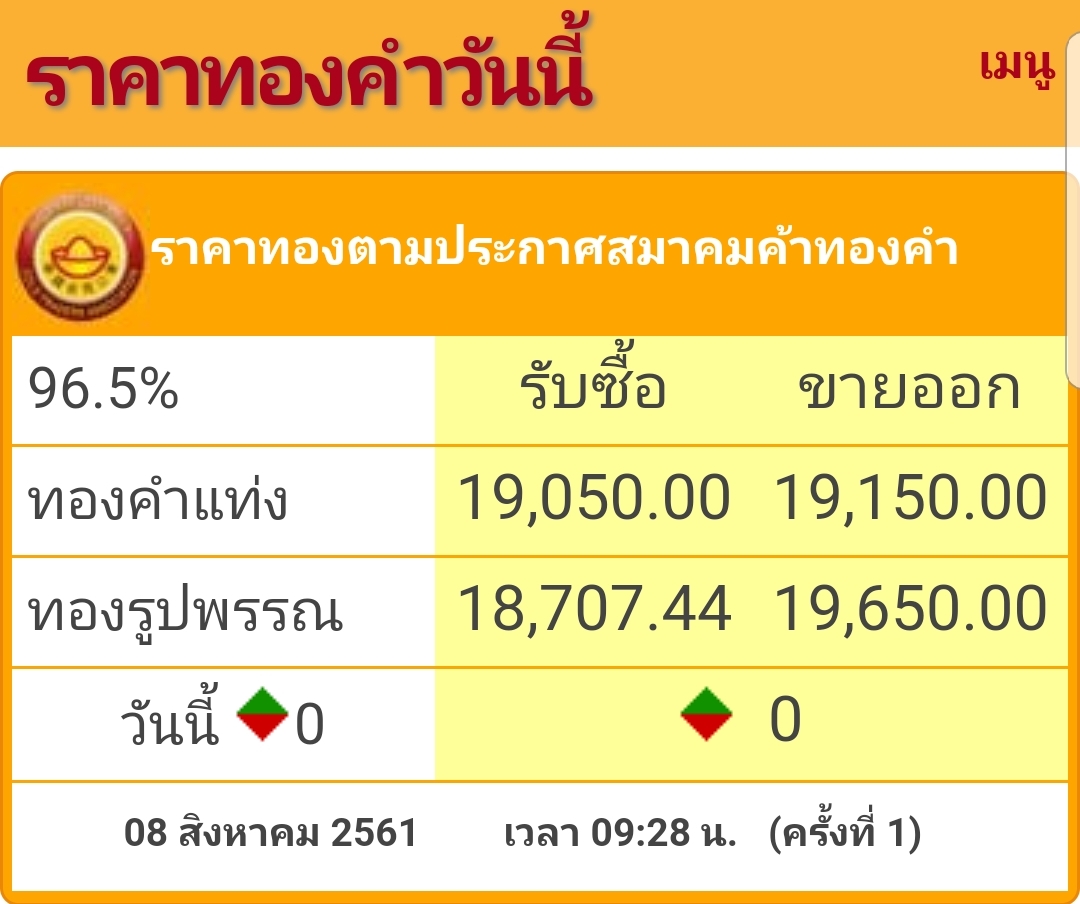 เมื่อเวลา 09.04 น. สมาคมค้าทองคำ ประกาศราคาครั้งแรก ดังนี้ - ทองคำแท่ง รับซื้อบาททองคำละ 57,600 บาท ขายออกบาททองคำละ 57,700 บาท - ทองรูปพรรณ รับซื้อบาททองคำละ 56,440.68 บาท ขายออกบาททองคำละ 58,500 บ
