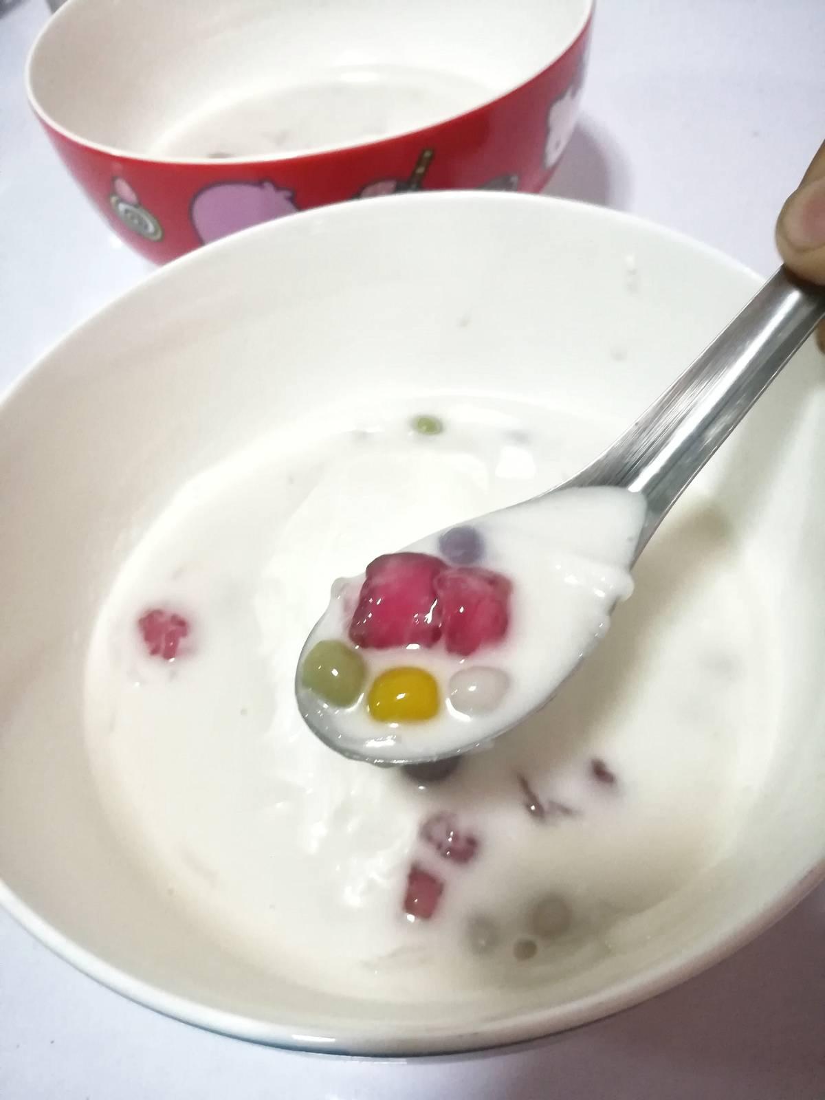 สีสวยมว๊ากกก สีแดงของทับทิมกรอบ ลอยเสนอหน้ามาคู่กับตัวบัวลอยสอง สามสี บนสีขาวนวลตาของน้ำกะทิ แถม มีเนื้อมะพร้าวชิ้นเรียวๆยาวๆโผล่ขึ้นมาให้เห็น เหมือนจะบอกว่า " กินฉันซิๆ " 555+++