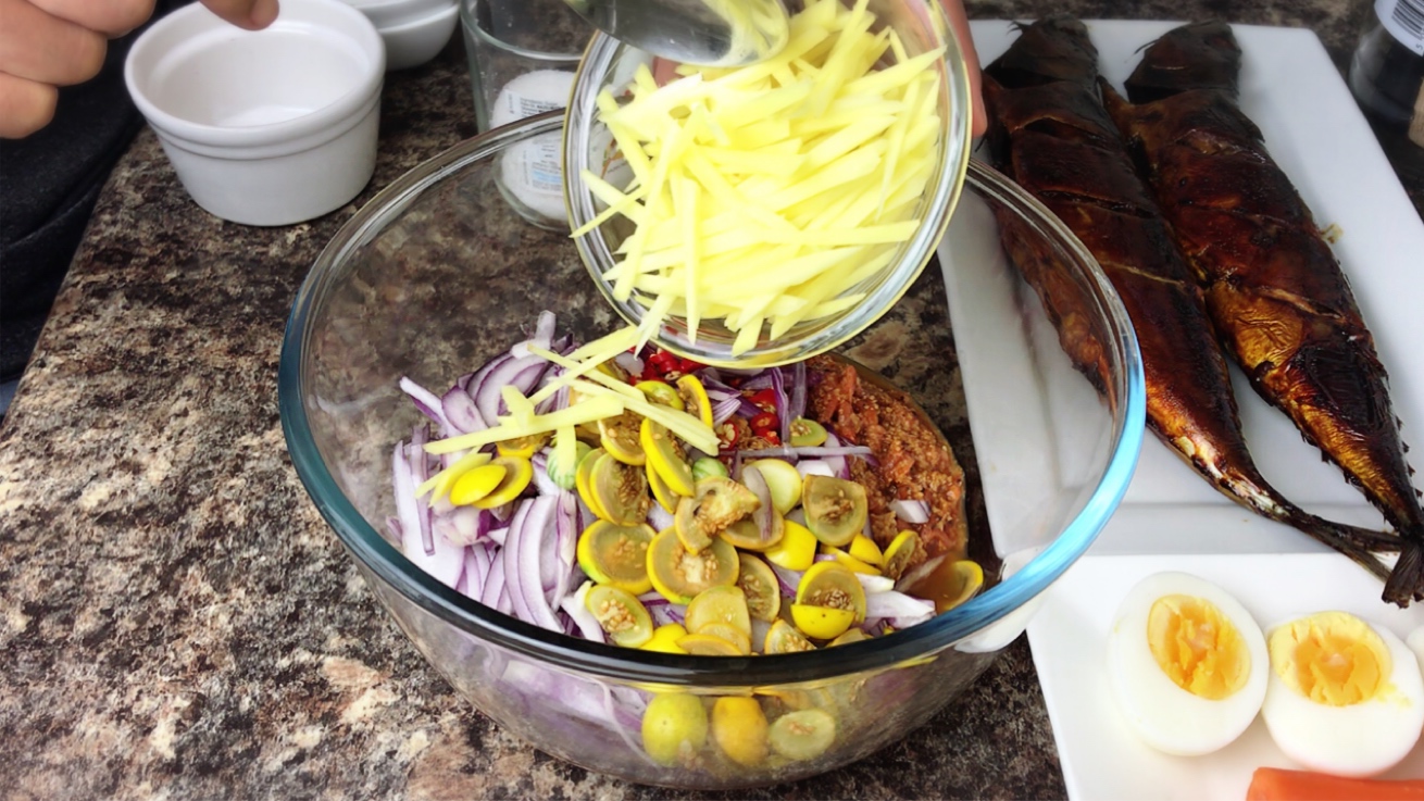 2. เทส่วนผสมทุกอย่างลงชาม พริก, ขิง, หัวหอมแดง, มะเขือขื่น, น้ำตาล, น้ำมะนาว คลุกเคล้าให้เข้ากันเป็นอันพร้อมรับประทาน