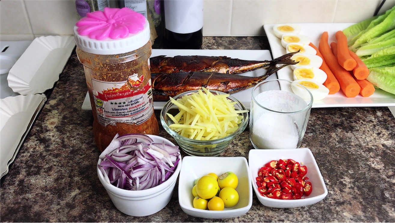1. เตรียมเครื่องปรุงทุกอย่างให้พร้อม ขิงซอย, หัวหอมแดงซอย, พริกซอย, มะเขือขื่นซอย