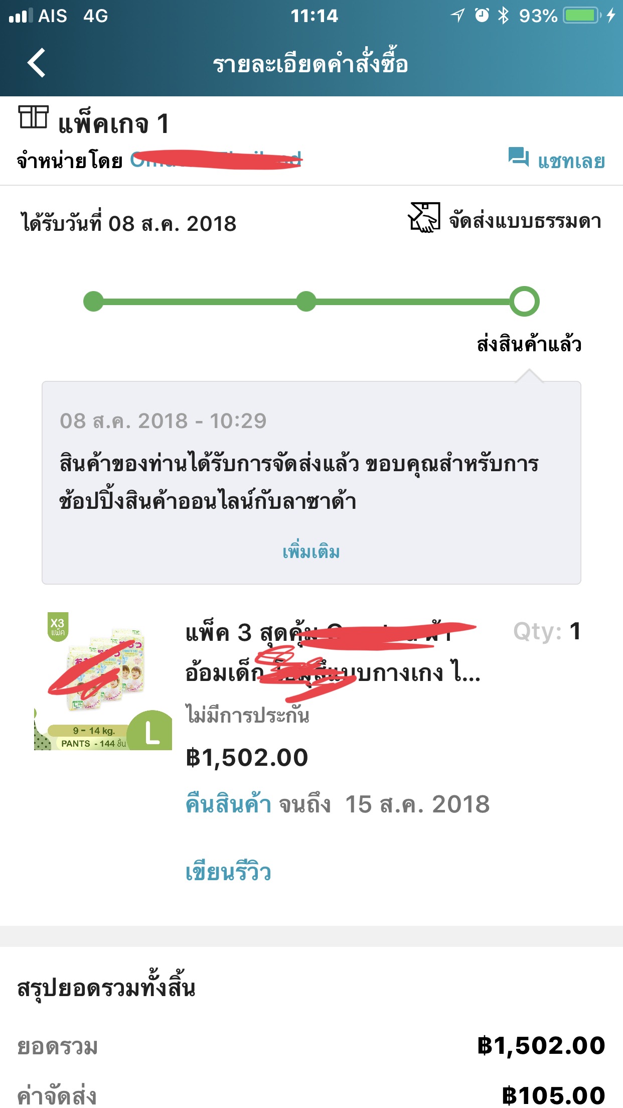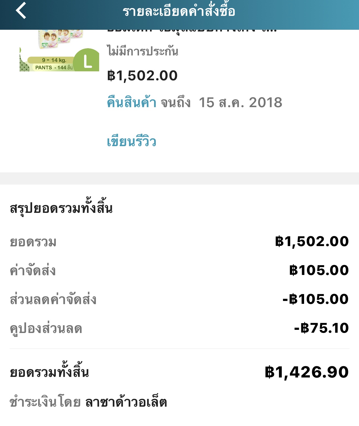 แต่วันที่4สิงหาคม2561สั่งผ้าอ้อมไป1ลังของแบรนด์ใหม่ราคาก็ไม่ถูกแต่คิดว่าถ้าหักเงินคืนวอเลท15%กับส่วนลด5%ก็พอรับได้