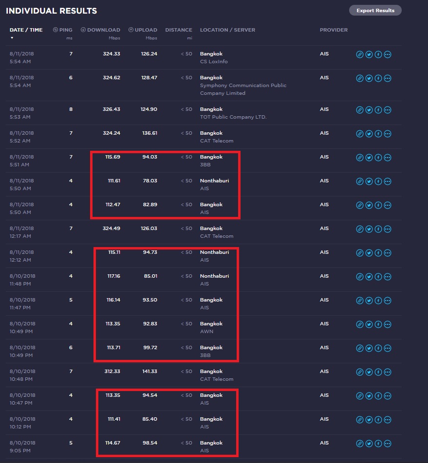 2. ส่วนที่ไม่ได้วงสีแดง ทดสอบกับ CAT, TOT ได้ความเร็วประมาณ 3XX ในฝั่ง download แต่ฝั่ง upload ได้แค่ 1xx เท่านั้น
