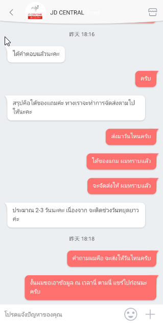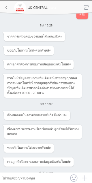 วันที่ 10 สิงหา ถึงวันที่เราต้องได้ของแถมแล้ว ยังไม่มีความเคลือ่นไหวใดๆ ไม่มีการติดต่อกลับมาเรื่องการส่งของ ยังไงละทีนี้ รู้สึกแย่ที่ 3 (คุณได้ 3 แย่ แล้วครับ JD Central ---ผมอดทนรอและใจเย็นมาถึงที่สุดแล้วครับ) เลยตัดสินใจติดต่อเข้าไปทางแชท เหมือนเดิมครับ เราจะดำเนินการตรวจสอบให้ บลาๆๆ แล้วก็หายไป ติดต่อพนักงานมากกว่า 5 คนได้ นี่มันคืออะไรครับ ระบบการบริหารจัดการหลังการขายของคุณแย่มากๆๆ หรือจริงๆคุณไม่ได้มีระบบอะไรรองรับ พนักงานถึงตอบอะไรไม่ได้เลย ปัญหาของคุณอยู่ที่ตรงไหนครับ JD Central ตั้งแต่เที่ยงที่ติดต่อไป จน 18.16 ได้รับคำตอบมาว่า เราจะส่งของให้ อีก 2-3 วัน เนื่องจากติดชว่งหยุดยาว ผมจะรอนะครับ จะดูว่าบทสรุปจะเป็นอย่างไร JD Central จะแก้ปัญหานี้ได้หรือไม่ และผมจะมาอัพเดทต่อไปครับ