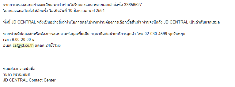 2.ติดต่อผ่านเมล์ cs@jd.co.th เราอยากมั่นใจว่าเป็นไปตามหน้าเว็บ เลยตัดสินใจติดต่อผ่านทางเมล์อีกครั้ง เมื่อวันจันทร์ ที่ 6 สิงหาคมก็ได้รับการยืนยันมาว่า จะส่งของแถมให้ภายใน 10 สิงหา ก็รอสิครับ รอๆ ระหว่างรอ ปรากฎว่า คนที่สั่งของทีหลังในวันถัดๆมากลับได้ของแถมมาพร้อมเครื่องเลย โอ้ๆๆ นี่มันคืออะไรครับ นี่คุณใช้การตลาดนำบริการขนาดนี้เลยเหรอ ลูกค้าที่ซื้อไปแล้วช่างมัน ขอขายลูกค้าใหม่ก่อน งี้เหรอ แทนที่จะส่งของแถมให้ลค ที่ซื้อไปก่อน นี่คือความรู้สึกแย่ที่ 2 แต่เราก็รอต่อไปอย่างมีความหวัง