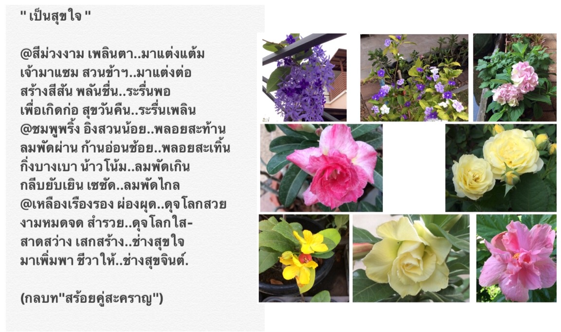 พันกวี ที่เคยอ่าน และผ่านตา กลั่นกรองมา เรียงร้อย ถ้อยบทใหม่ สร้อยอักษร กลอนเก่า เฝ้าเก็บไว้ นำมาใช้ อ้างอิง ทุกสิ่งอัน กรอบกำหนด กฏเกณฑ์ เป็นโครงร่าง เพียงเสริมสร้าง รูปแบบ คับแคบนั่น แต่ทำนอง เสียง