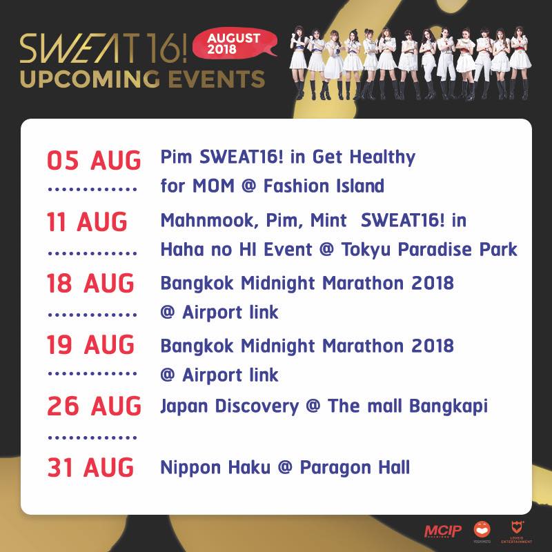 วันที่ 31 สิงหาคม - 2 กันยายน 2561 Nippon Haru Bangkok 2018 @ Siam Paragon / โดยแสดงในวันเสาร์ที่ 1 กันยายน 2561 เวลา 17.00 - 18.00 น. SWEAT16! Live Stage และกิจกรรม ชมคอนเสิร์ต จับมือ ถ่ายรูป อย่างใกล้ชิดดด พร้อมเปย์สินค้า ติดตามได้ที่