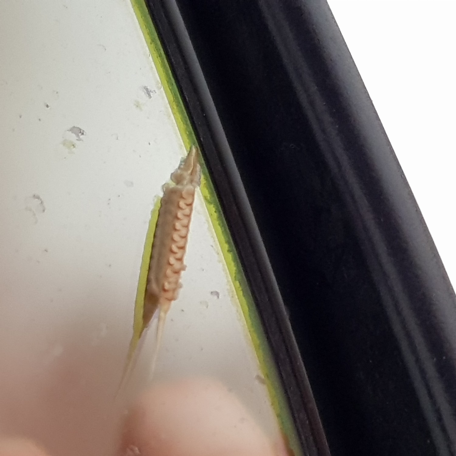 ก่อนหน้านี้เห็นเป็นไข่แข็งๆ เกาะอยู่ที่กระจกตรงระเบียง ยาวประมาน 1 เซน ก็นึกว่าไข่ผีเสื้อครับ เลยปล่อยทิ้งไว้ ประมาณ 1 สัปดาห์ มันก็ฟักออกมาเป็นแบบนี้อ่ะครับ เลยสงสัยว่าเป็นตัวอะไร อันตรายหรือเปล่าคร