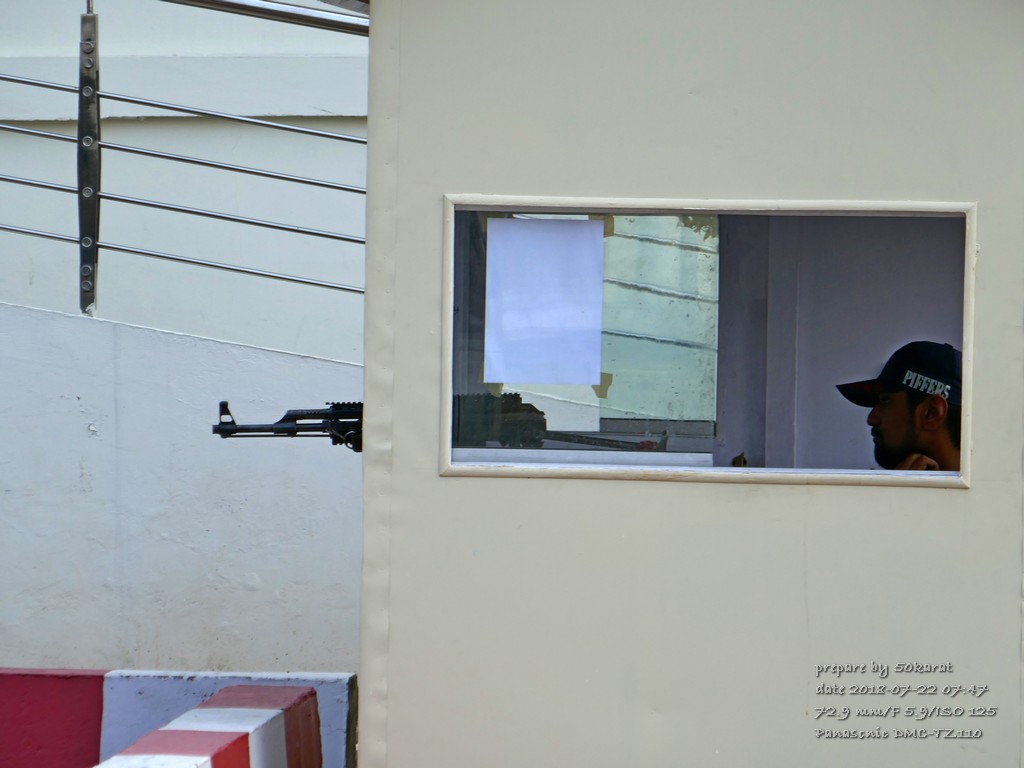 ตอนจะเข้าโรงแรมนี่ต้อง scan ของชิ้นใหญ่กัน พนักงานรักษาความปลอดภัยถือปีนกลประจำกาย