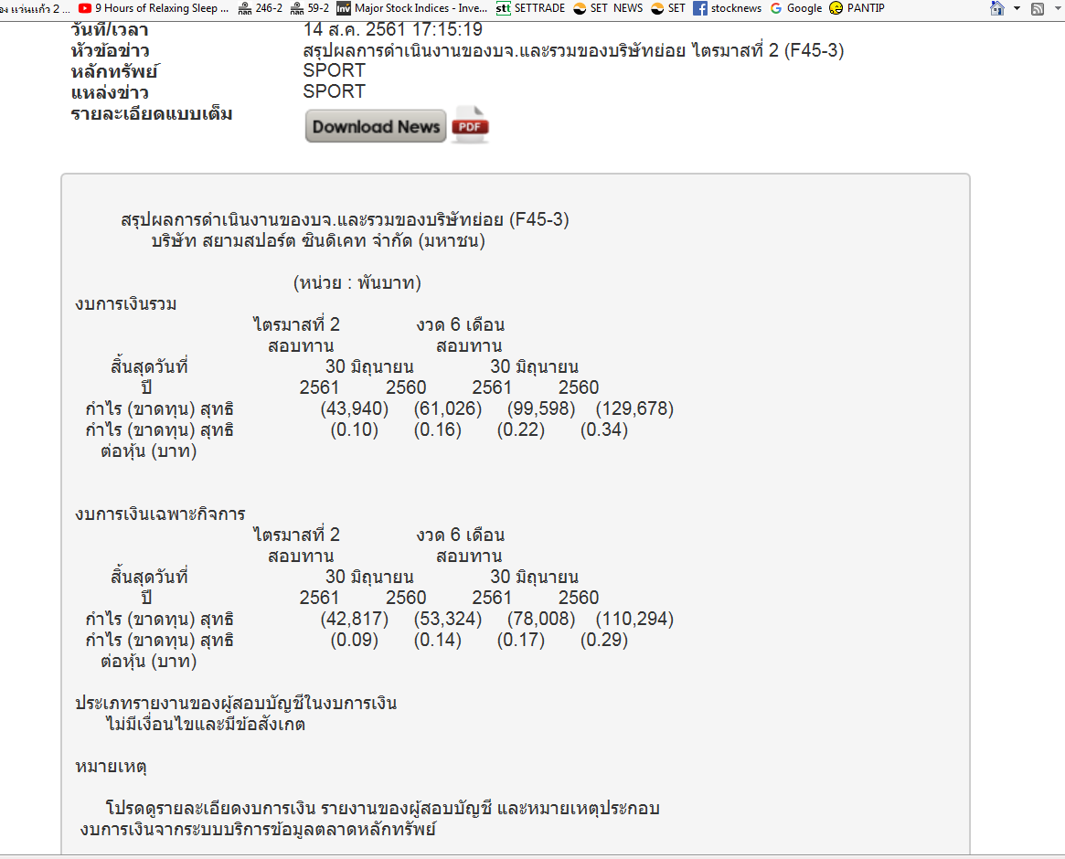 SPORT fc : ส่วนผู้ถือหุ้น 30/6/2561 เหลือเพียง 3.70 ล้านบาท